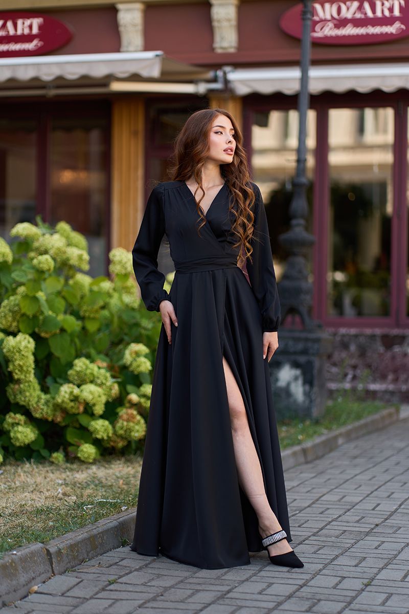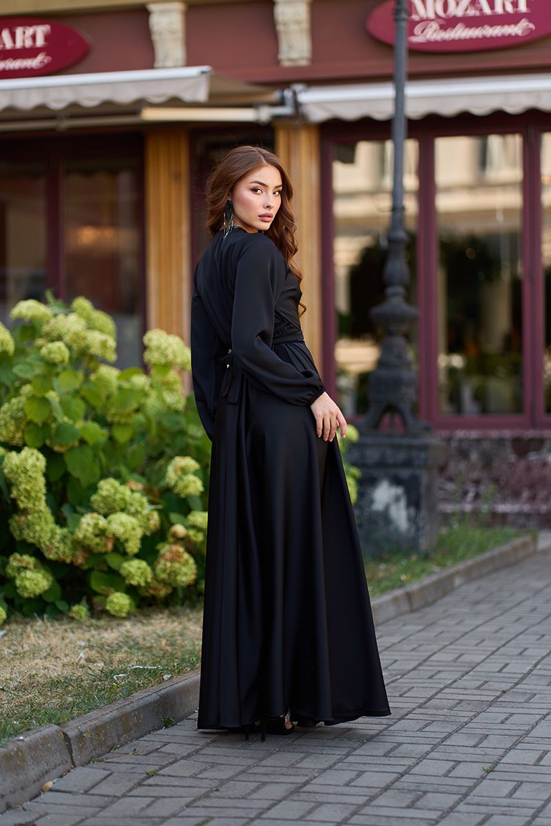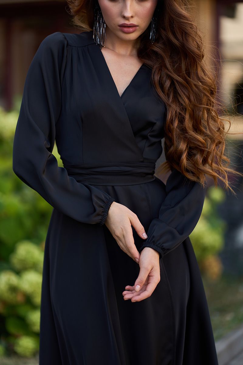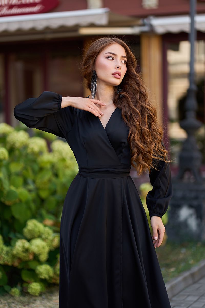 Ця сукня — справжнє втілення вишуканості та витонченого стилю. Модель має крій на запах, що дозволяє регулювати посадку на талії та підкреслює жіночні лінії фігури. Широка стрічка-накладка підкреслює талію, а глибокий розріз додає образу спокусливості. Атласна тканина «дабл сатин» створює розкішне сяйво при кожному русі, а чорний колір надає глибини та статусності образу. Довгі рукави з манжетами на резинці додають завершеності, а вставка на резинці по спинці забезпечує комфортну посадку незалежно від типу фігури.