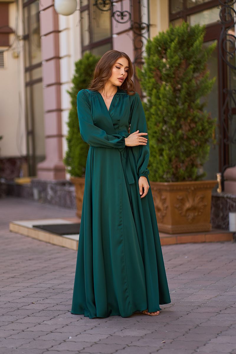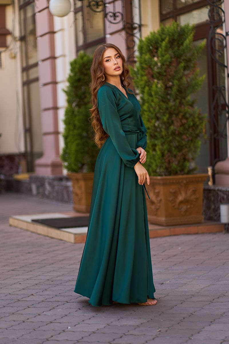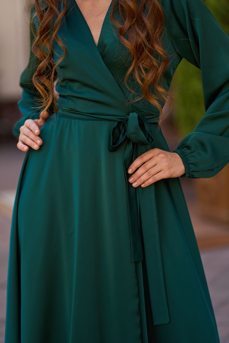 Зелена Вечірня сукня атлас на запах 25070 — це втілення сучасної жіночності, витонченості й трендової елегантності в одному образі. Глибокий смарагдовий колір не лише акцентує увагу, а й надає образу глибини та розкоші. Фасон на запах підкреслює талію, дозволяючи регулювати посадку на фігурі, а глибокий розріз додає пікантності та візуально видовжує ноги. Еластичні вставки на манжетах та по спинці талії забезпечують комфорт у русі та гарну посадку. Модель виконана з делікатного дабл сатину, що м’яко лягає по тілу, створюючи струмливу лінію низу. Пояс у комплекті. Доступна розмірна сітка — від S до 3XL. Колірна гама — бордо, шоколадний, зелений, чорний, молочний.