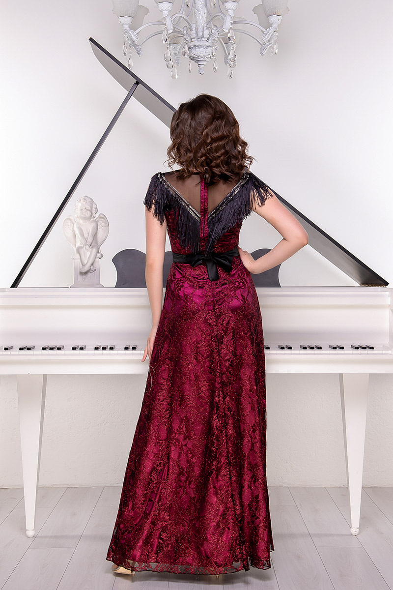 яка не лише виділить вас, а й дозволить відмовитись від додаткового декору з Бордова Вечірня Сукня Гіпюр Бахрома 9046