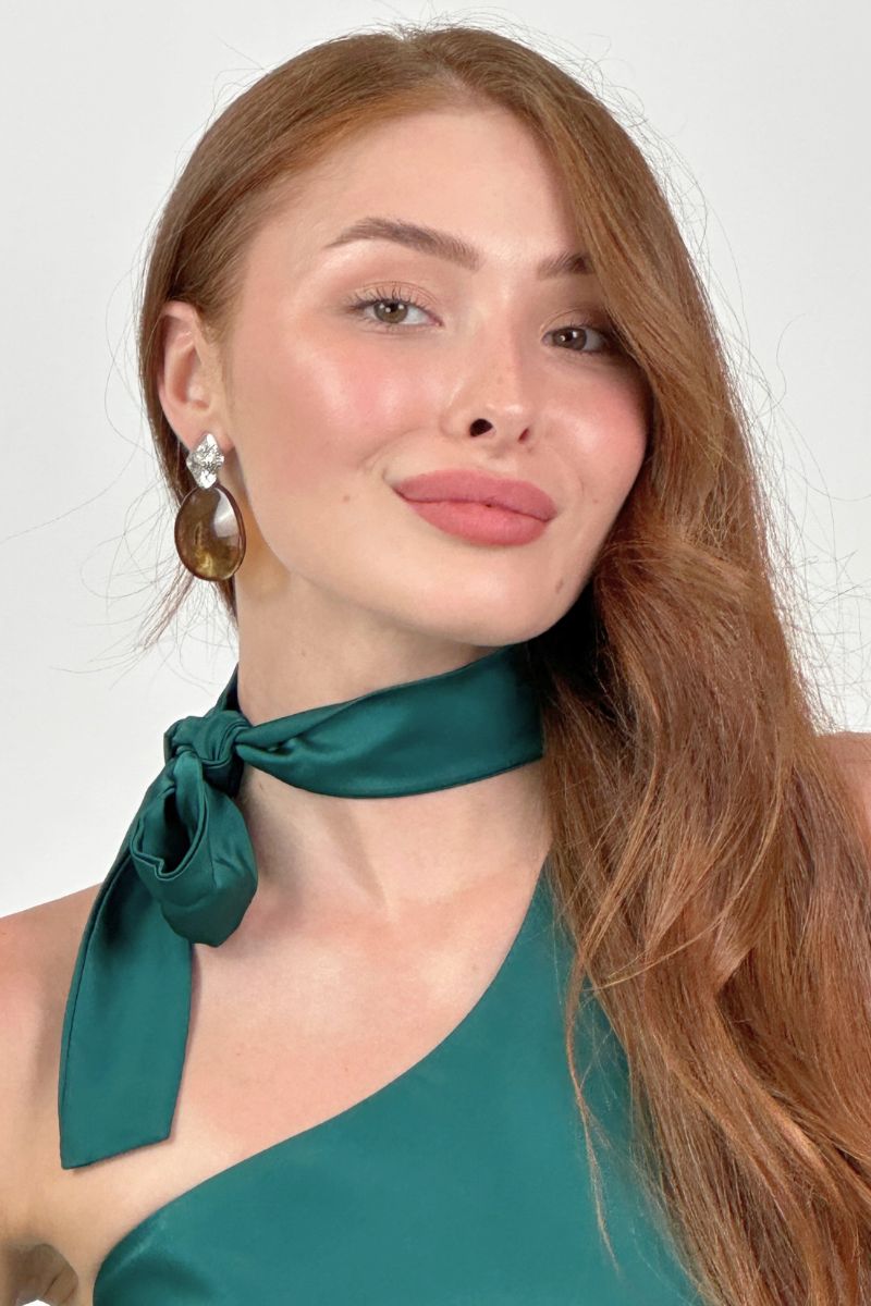 Зелена Вечірня Сукня Комбінація Шовк Максі 25055 — це ідеальний варіант для тих, хто шукає не просто сукню, а справжню заяву про стиль і впевненість. Асиметричний крій з елегантним воротником-галстуком підкреслює вишуканість лінії плечей, а благородний зелений колір додає образу глибини та свіжості. Сукня виготовлена з преміального дабл сатину, а її особливий крій під кутом 45 градусів дозволяє м’яко облягати фігуру, створюючи ефект ідеальної посадки.