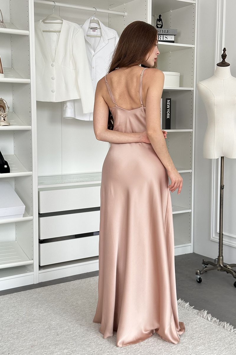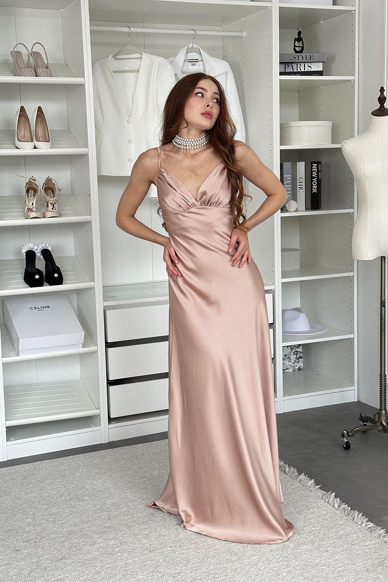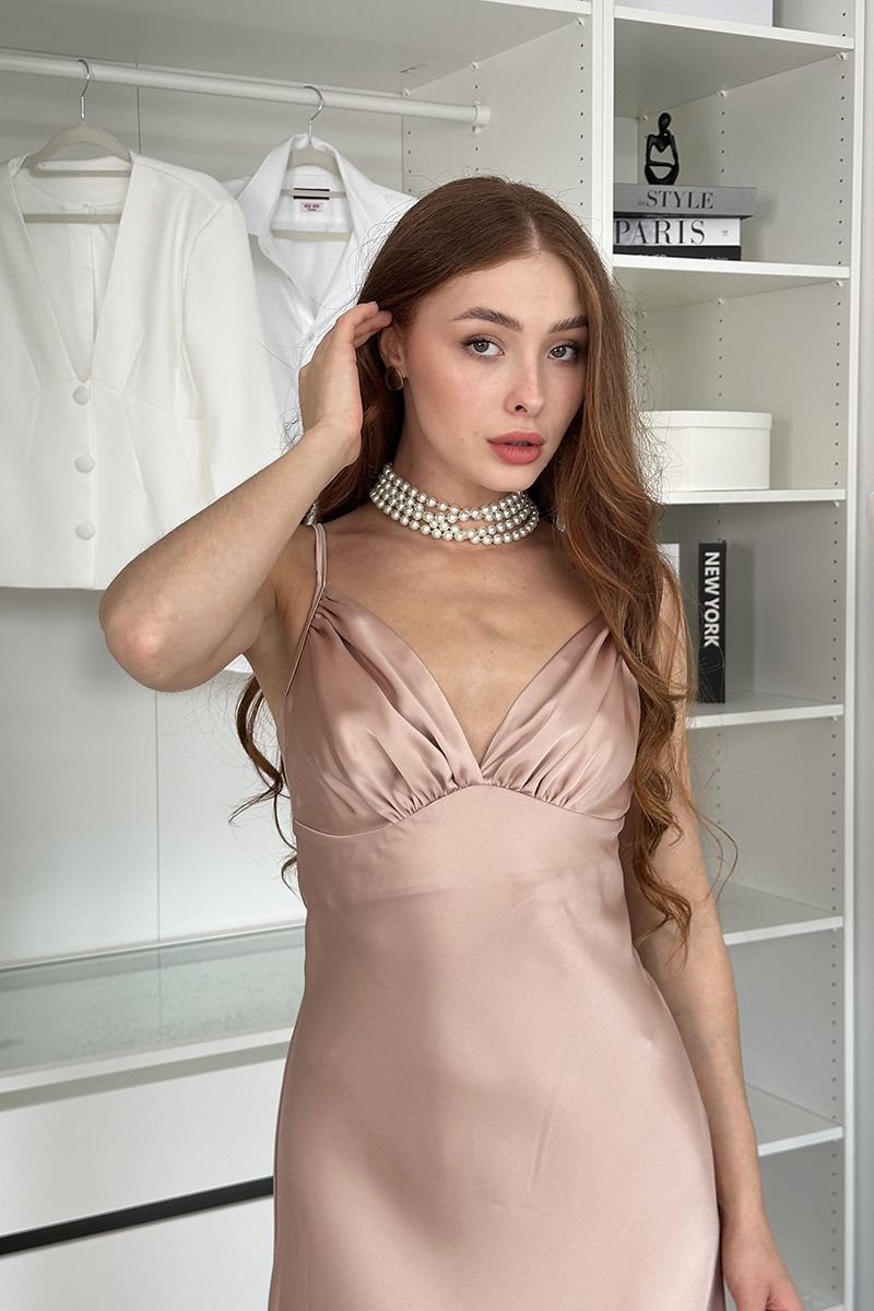 Ця модель — ідеальний вибір для вечора, побачення, фотосесії або особливої події, де хочеться вразити без зайвої театральності. Сукня розкриває жіночність через пластику тканини, а пудровий відтінок дарує образу ніжність і благородство.
