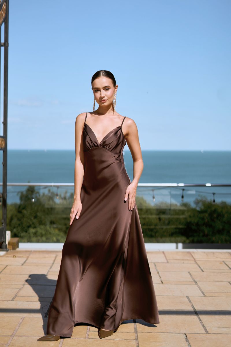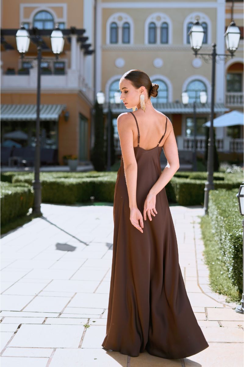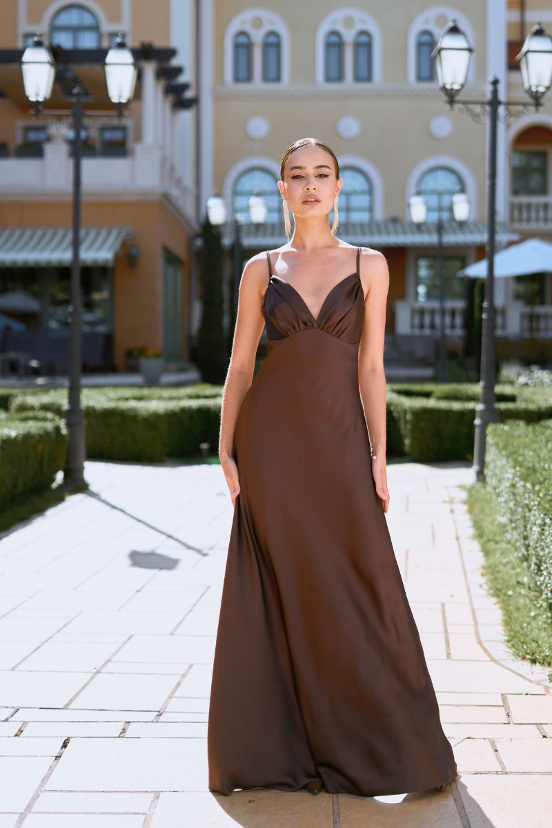 Шоколадна Вечірня Сукня Комбінація Шовк Максі 25057 — це втілення стриманої чуттєвості та витонченої елегантності. Модель створена з розкішного дабл сатину, який м’яко обтікає фігуру та створює вишуканий силует з легким блиском.