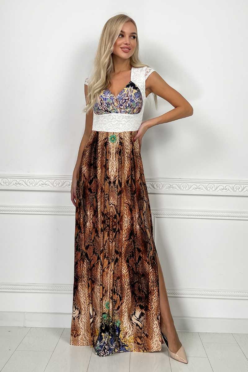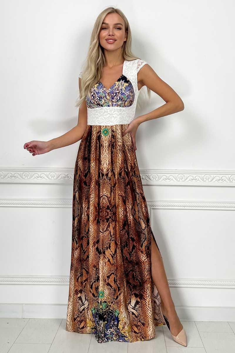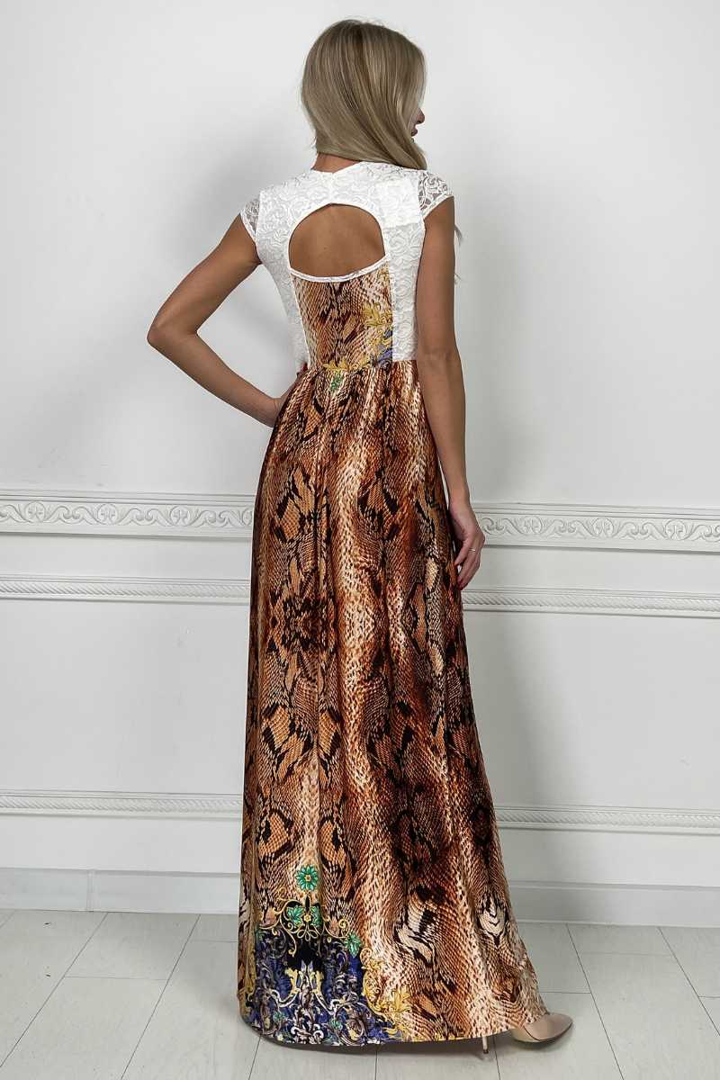 Коричнева Вечірня сукня Кристал Максі 4195 — вишуканий вибір для справжніх пошановувачок елегантності. Сукня зроблена з трикотажної тканини кристалл с анімалістичним принтом і доповнена гіпюровими вставками, що надає моделі вишуканості. На спинці виріз і застібка на гудзик, що зробить ваш образ більш оригінальним.
