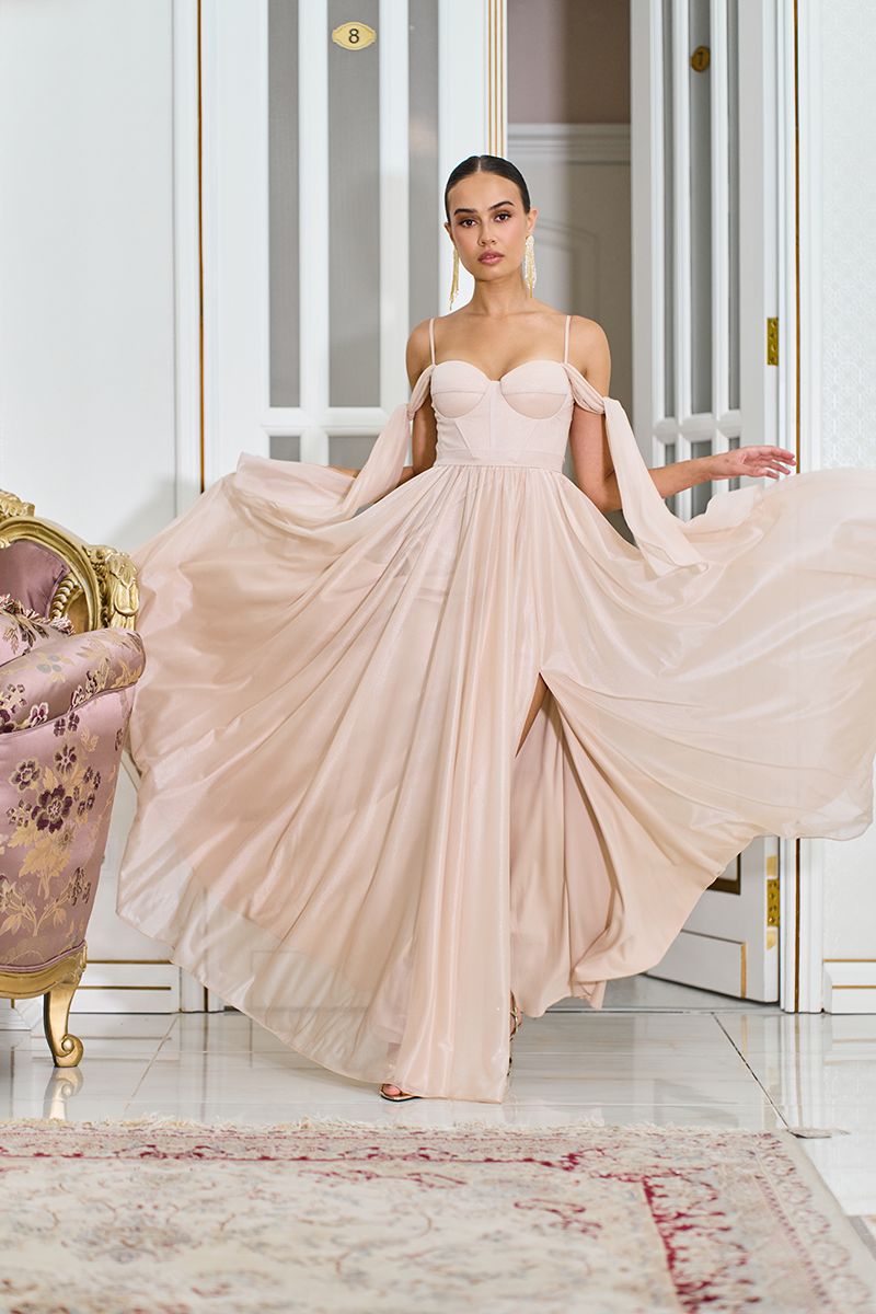 Бежева Вечірня Сукня Ліф Корсет Максі 25041 — це поєднання ніжності, розкоші та жіночності в одному образі. Виготовлена з шифону з райдужним переливом та трикотажною підкладкою в тон, ця сукня зачаровує своїм вишуканим сяйвом при кожному русі. Ліф з формованими чашками та корсетними кісточками надає надійної підтримки та ідеального силуету, а регульовані бретелі і декоративні зав’язки на плечах додають романтичного акценту. Потайна блискавка на спинці дозволяє легко одягати сукню, не порушуючи гармонії її крою.