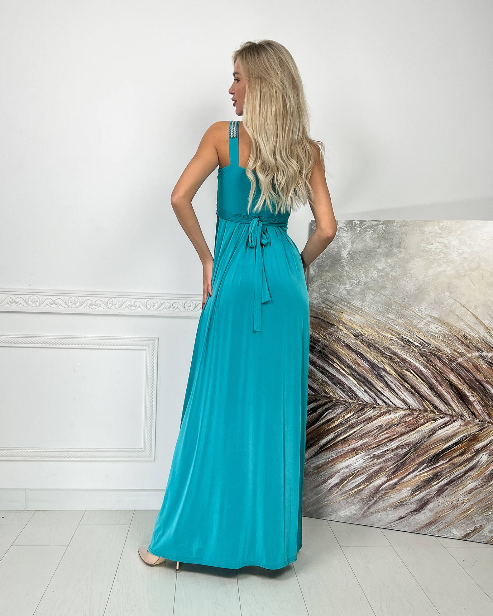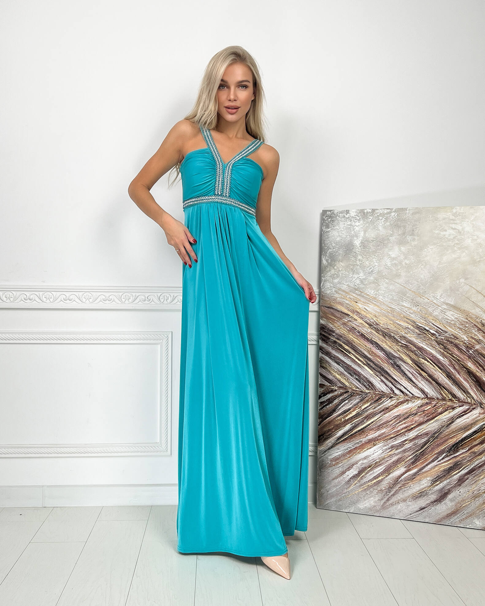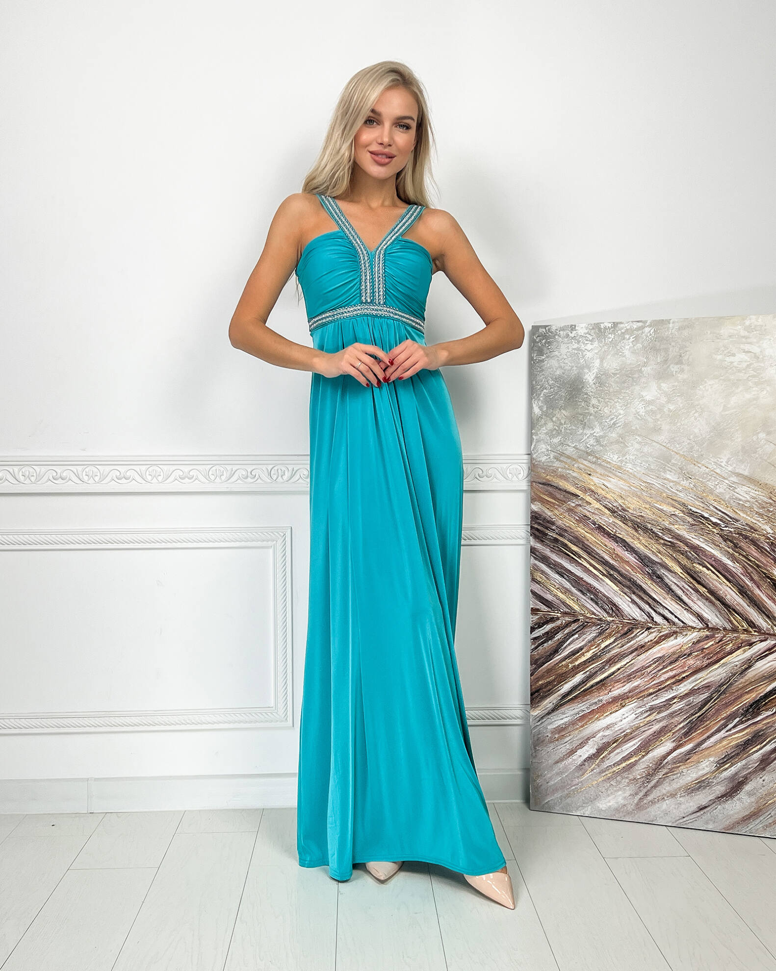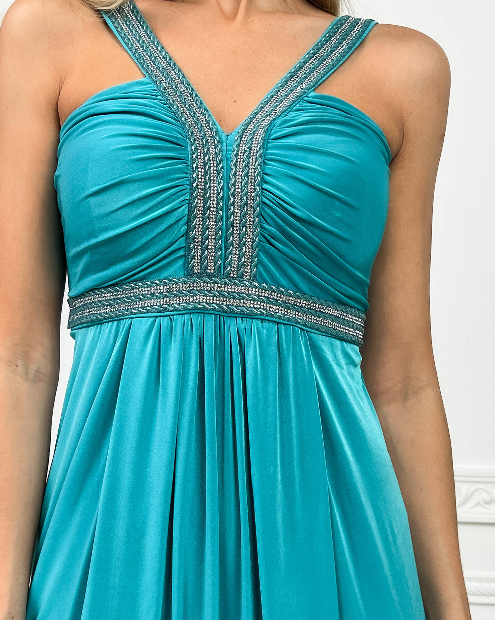 Бірюза Вечірня Сукня Максі Стрази 5174 – ваш ключ до незабутнього вечора, наповненого стильними компліментами.