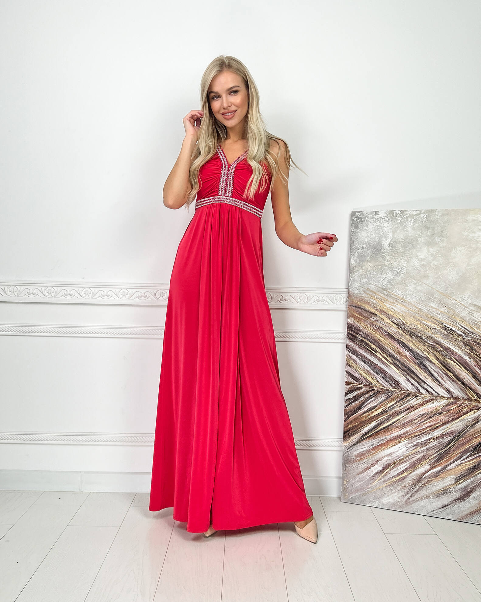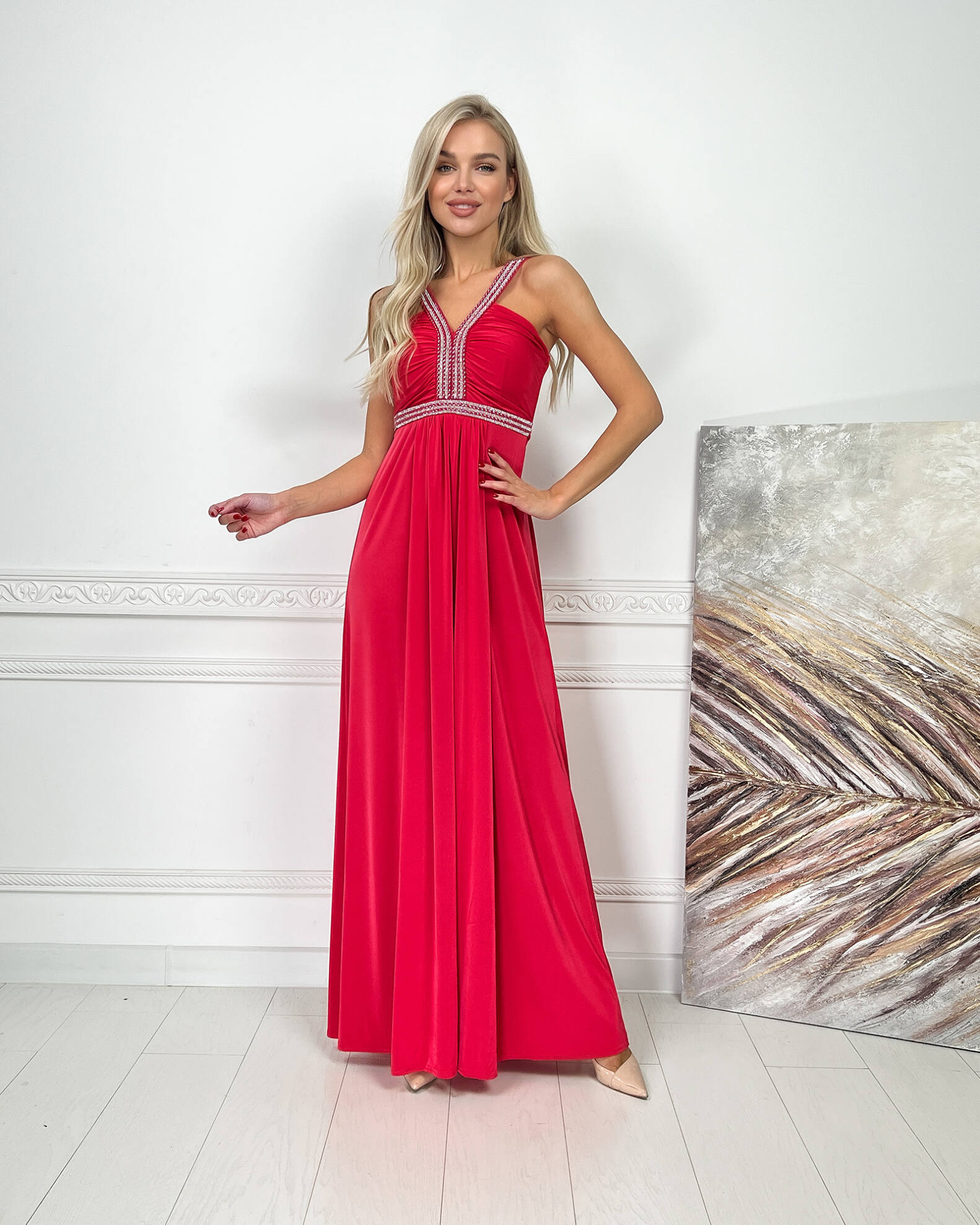 Червона Вечірня Сукня Максі Стрази 5174 – ваш ключ до незабутнього вечора, наповненого стильними компліментами.