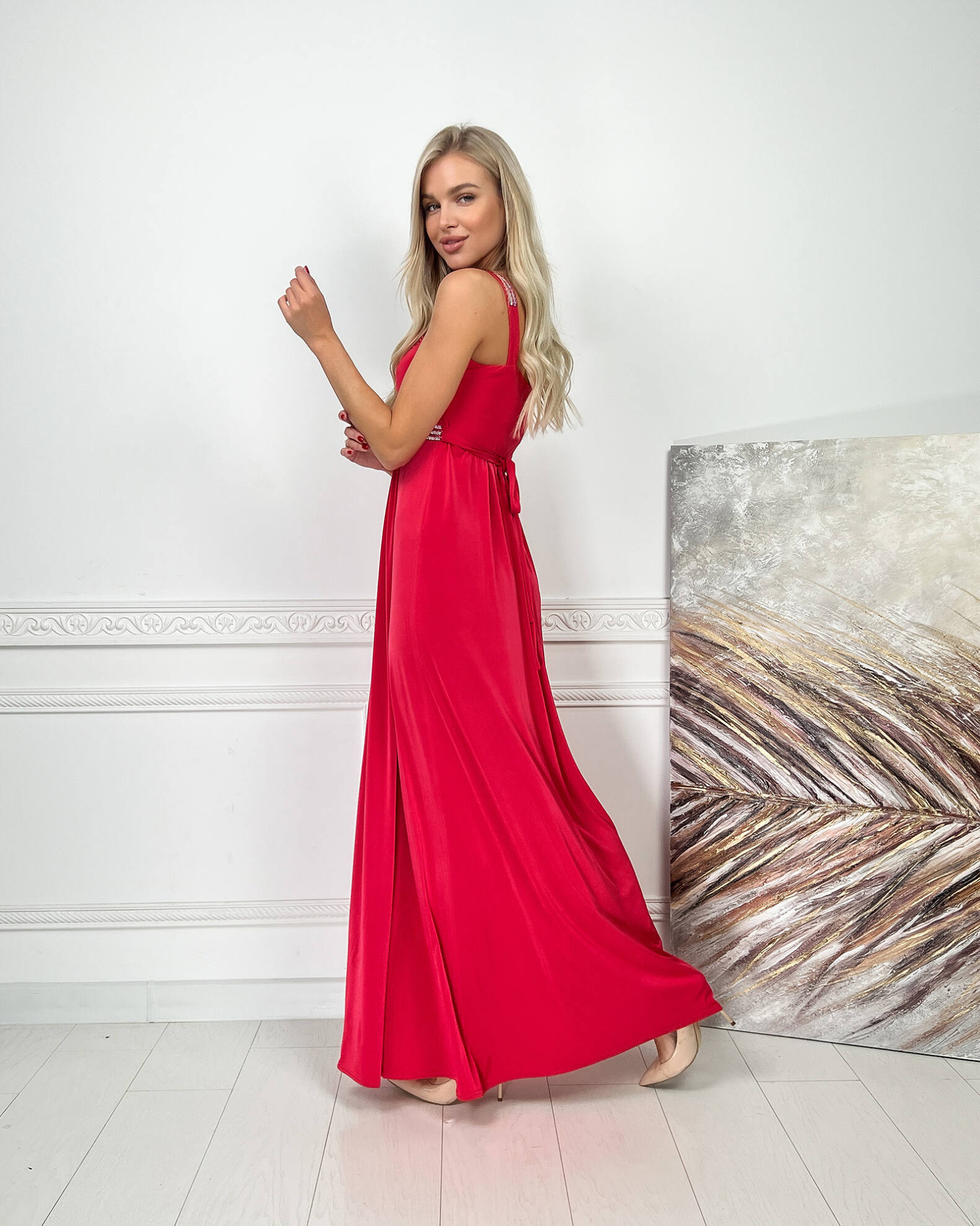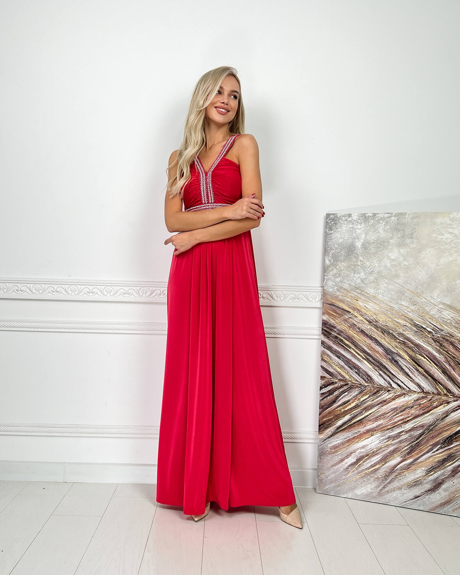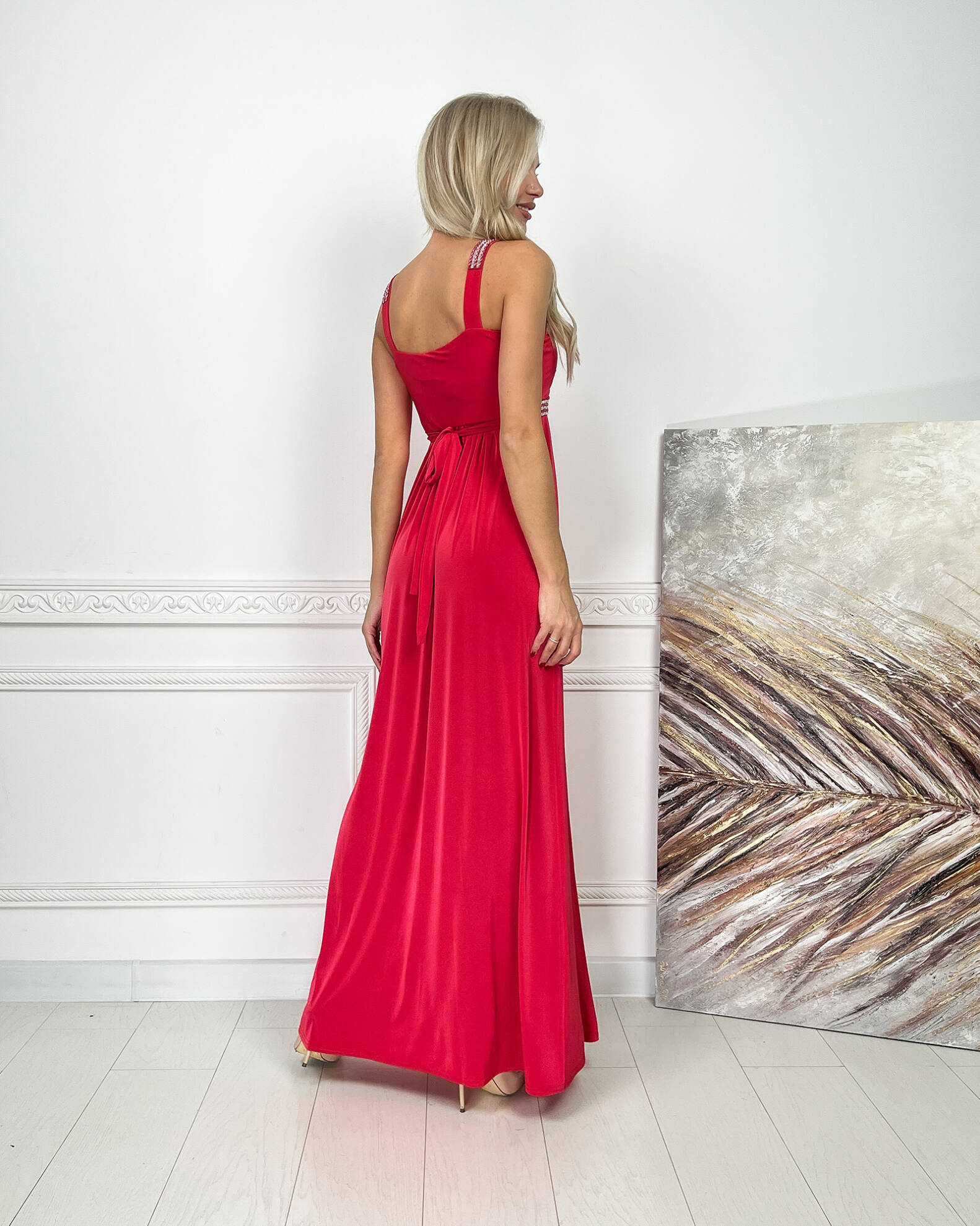 Червона Вечірня Сукня Максі Стрази 5174 – це елегантний вибір для важливих подій та вечірок. Сукня виконана з трикотажної тканини “кристал”, яка ніжно огортає фігуру, створюючи витончений силует. Бретелі та пояс декоровані блискучими стразами, що додає образу розкішного вигляду. Сукня має довжину максі та включає пояс, який підкреслює талію. Плаття продається по розпродажі в останніх розмірах S, M, L.