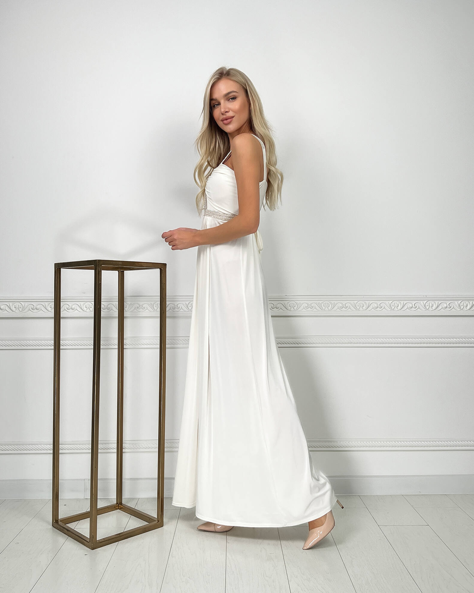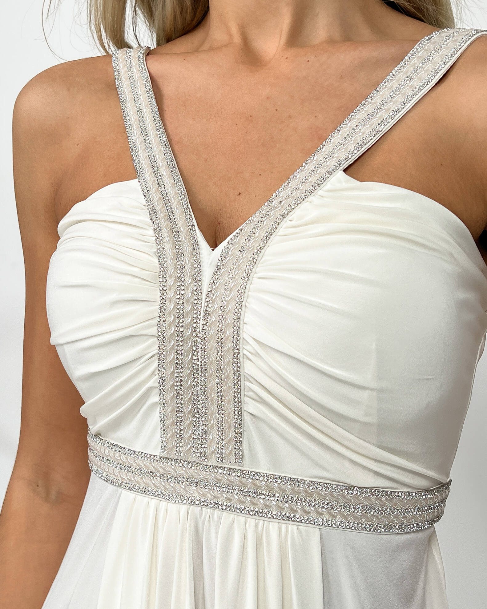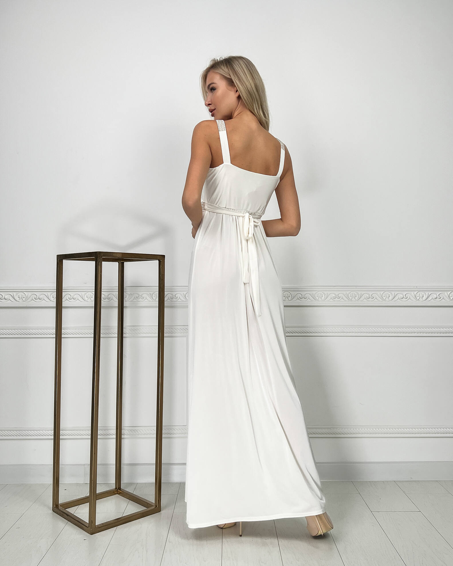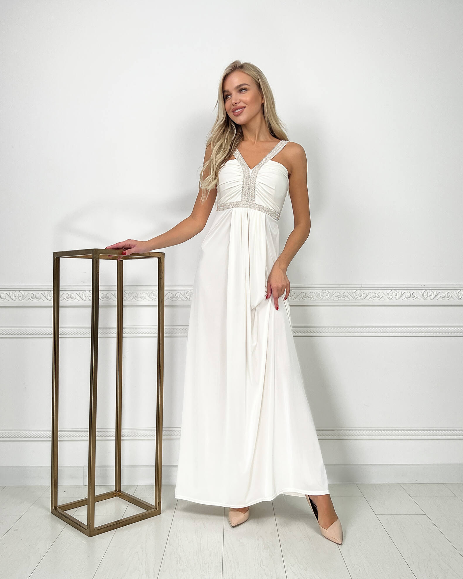 Молочна Вечірня Сукня Максі Стрази 5174 – ваш ключ до незабутнього вечора, наповненого стильними компліментами.