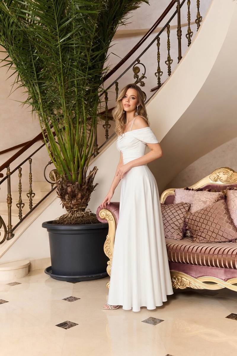 Молочна Вечірня сукня максі з драпірованим ліфом 26015 — це образ легкості, чистоти та жіночності, який виглядає дорого і благородно без зайвих деталей. М’який молочний відтінок створює ефект свіжості та витонченості, підкреслюючи природну красу та делікатність образу.