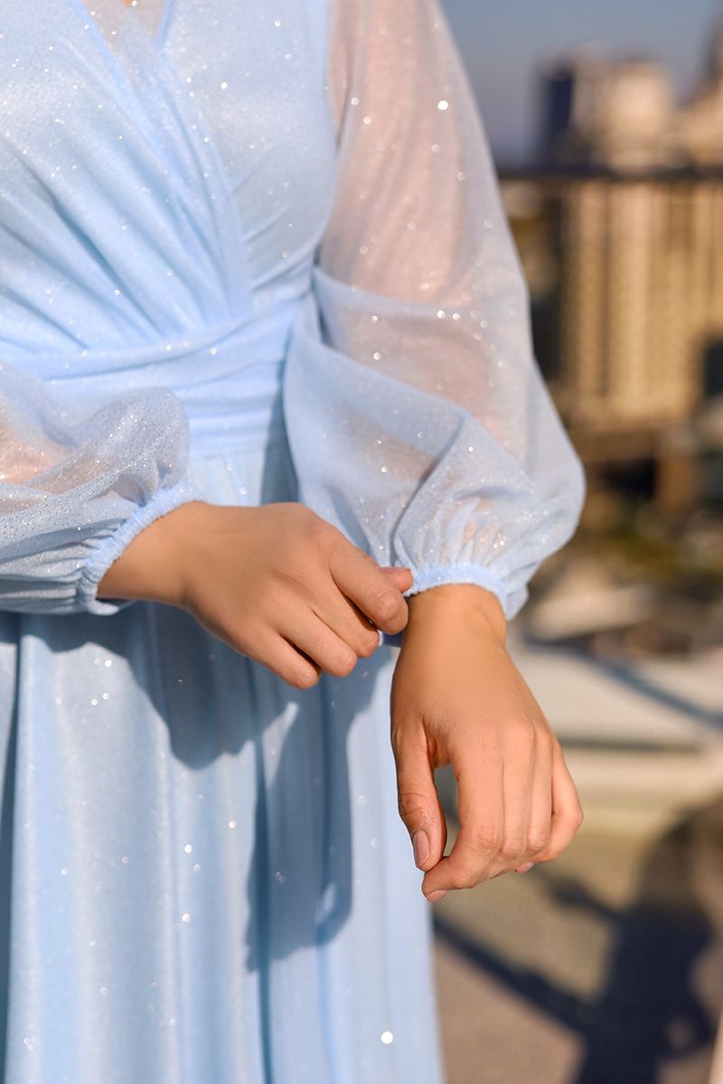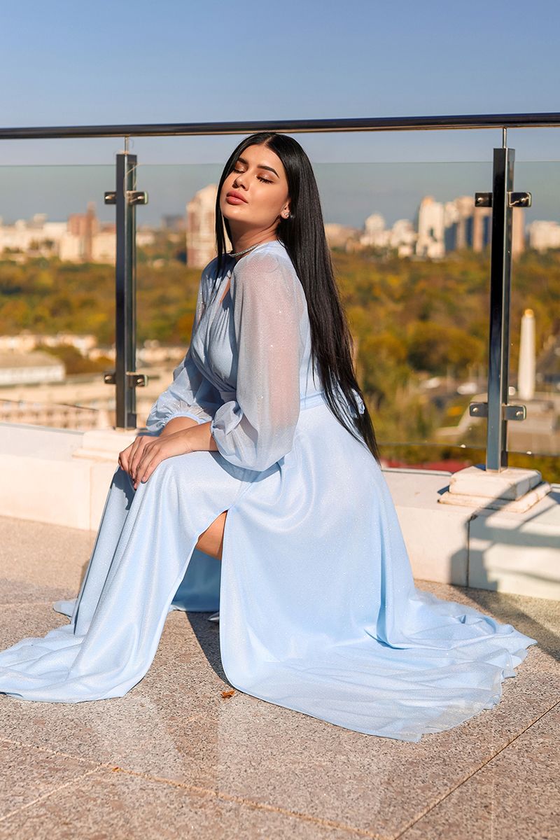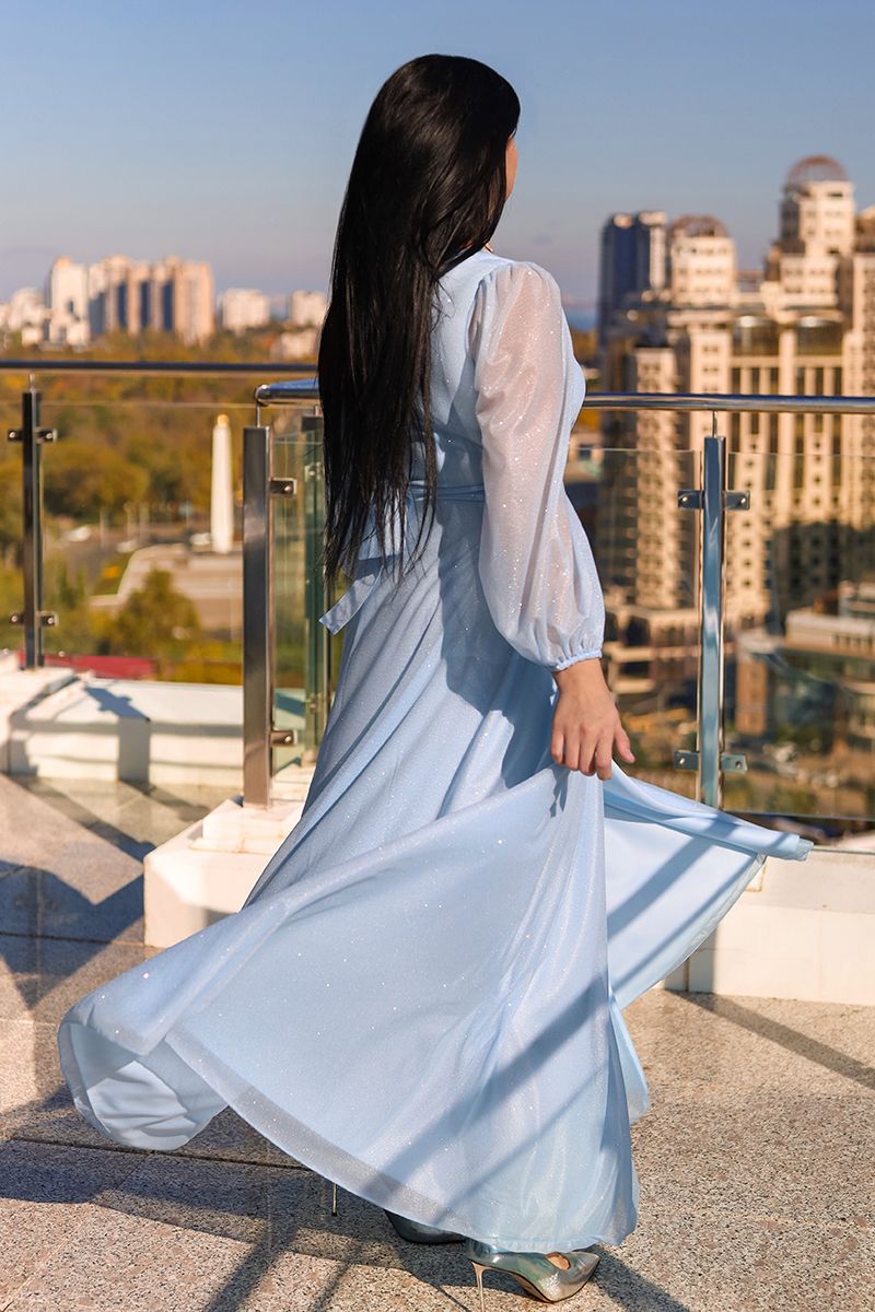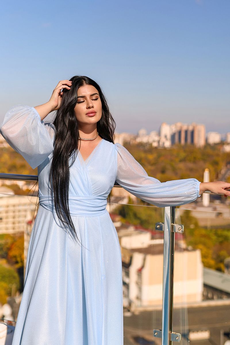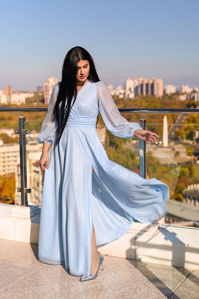 Блакитна Вечірня сукня шифон блиск максі 25081 створена для ніжних і повітряних образів, які дарують легкість навіть у спекотний день. Ніжний відтінок блакитного шифону з вкрапленнями блиску вловлює сонячне світло та додає вам магнетизму. Завдяки глибокому, але скромному декольте та вільному крою з акцентом на талії — сукня виглядає елегантно та гармонійно. Довгі прозорі рукави на резинках і м’яка підкладка забезпечують зручність і впевненість у кожному русі.