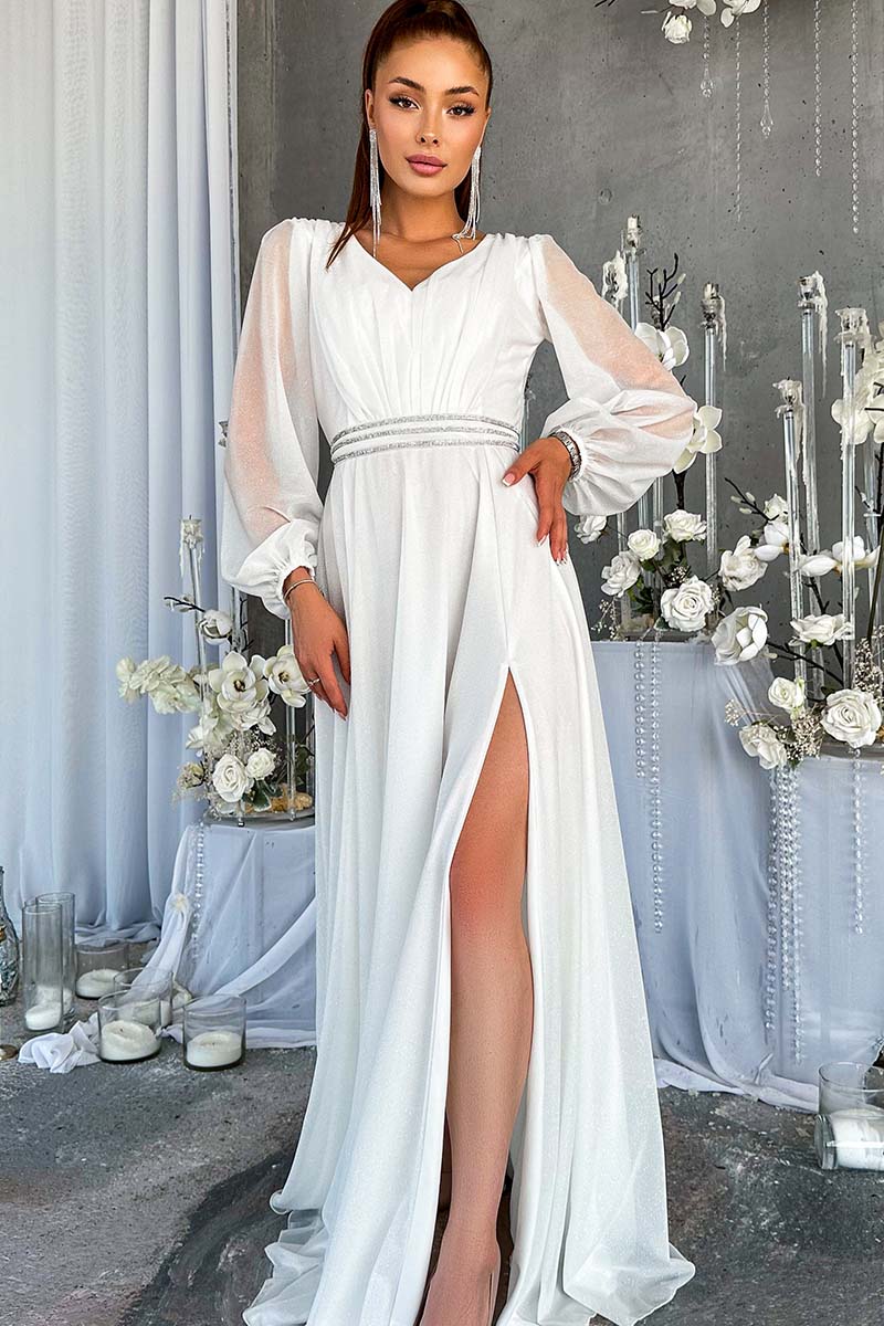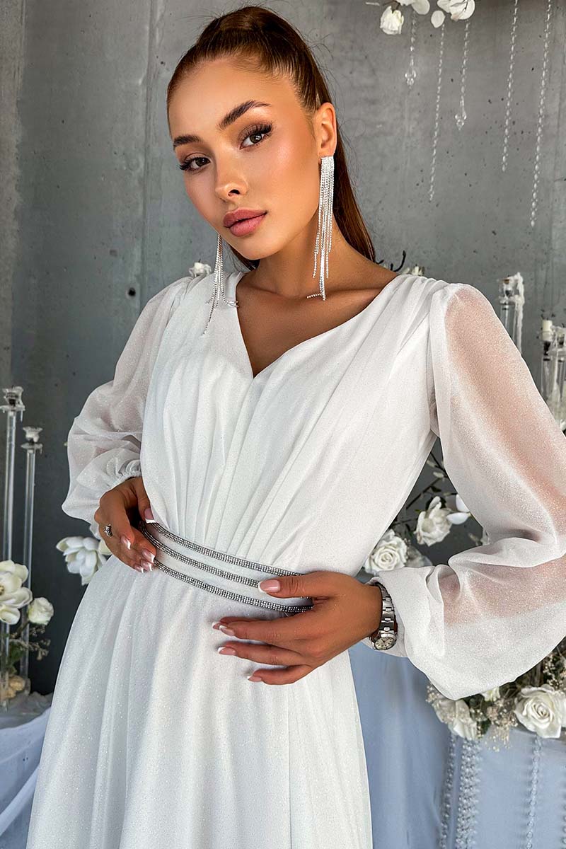 Акцент на талії зроблений знімним, блискучим поясом, який йде в комплекті. З одного боку виконаний елегантний розріз до стегна. Довжина Молочна Вечірня Сукня Шифон Стрази 23058 максі, а по спині вшита прихована застібка-блискавка.