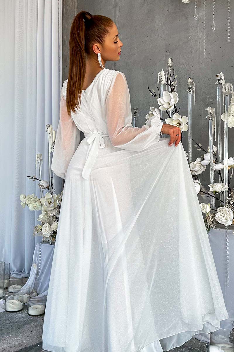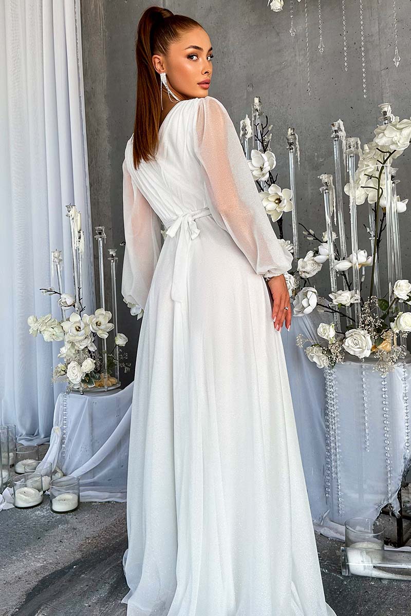Має V подібне глибоке декольте, довгий прозорий рукав зібраний на гумку в об’ємний ліхтарик. У виробі відрізна талія, за рахунок чого сукня плавно розширена донизу легкими хвилями.