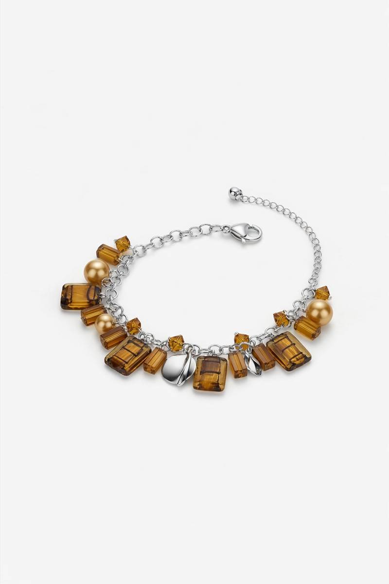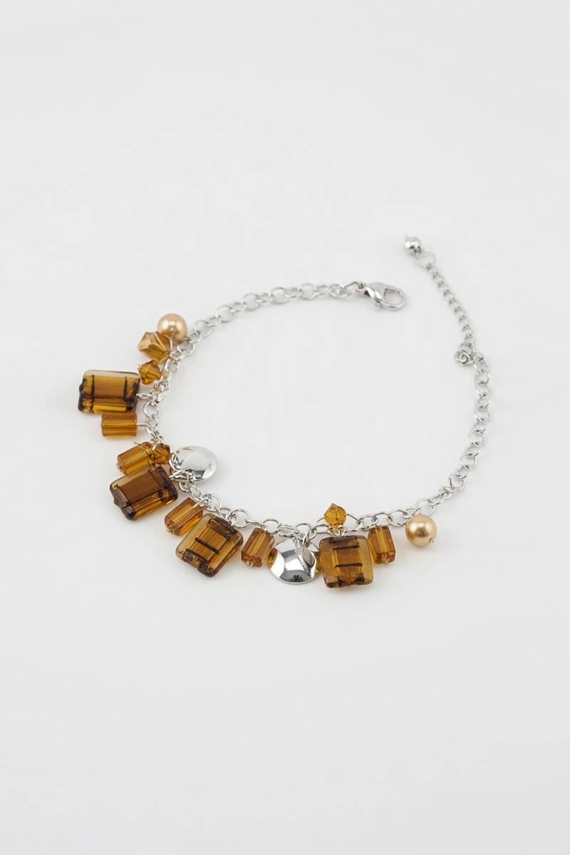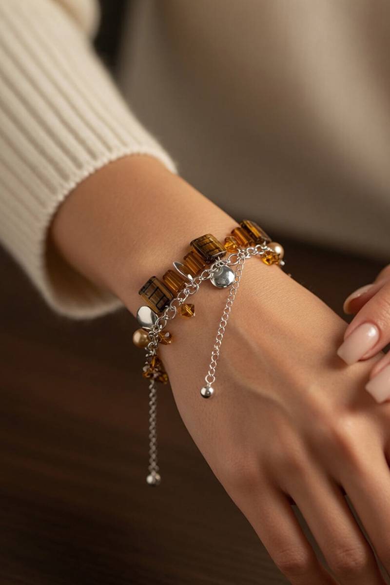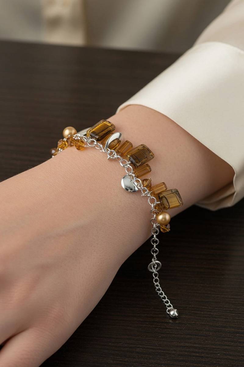 Цей сріблястий жіночий браслет з підвісками у бурштинових відтінках чудово поєднується з вечірніми, коктейльними та повсякденними образами. Особливо гарно він виглядає з сукнями у молочному, бежевому, шоколадному, чорному та золотистому відтінках.