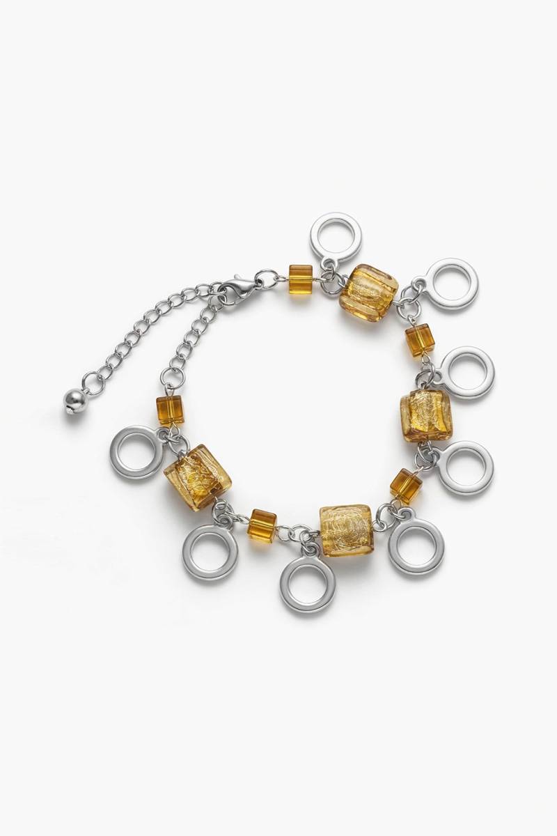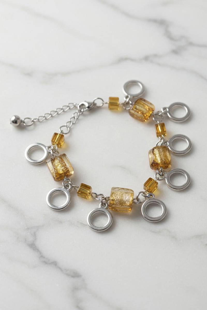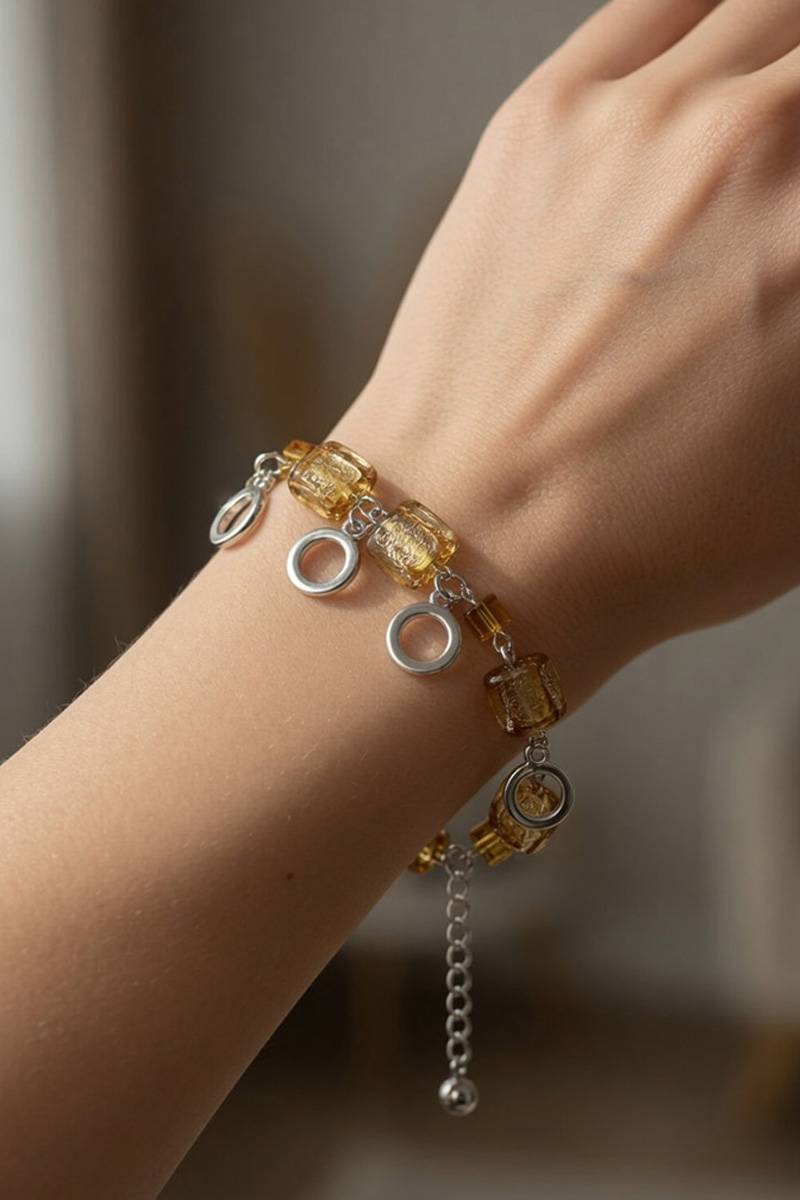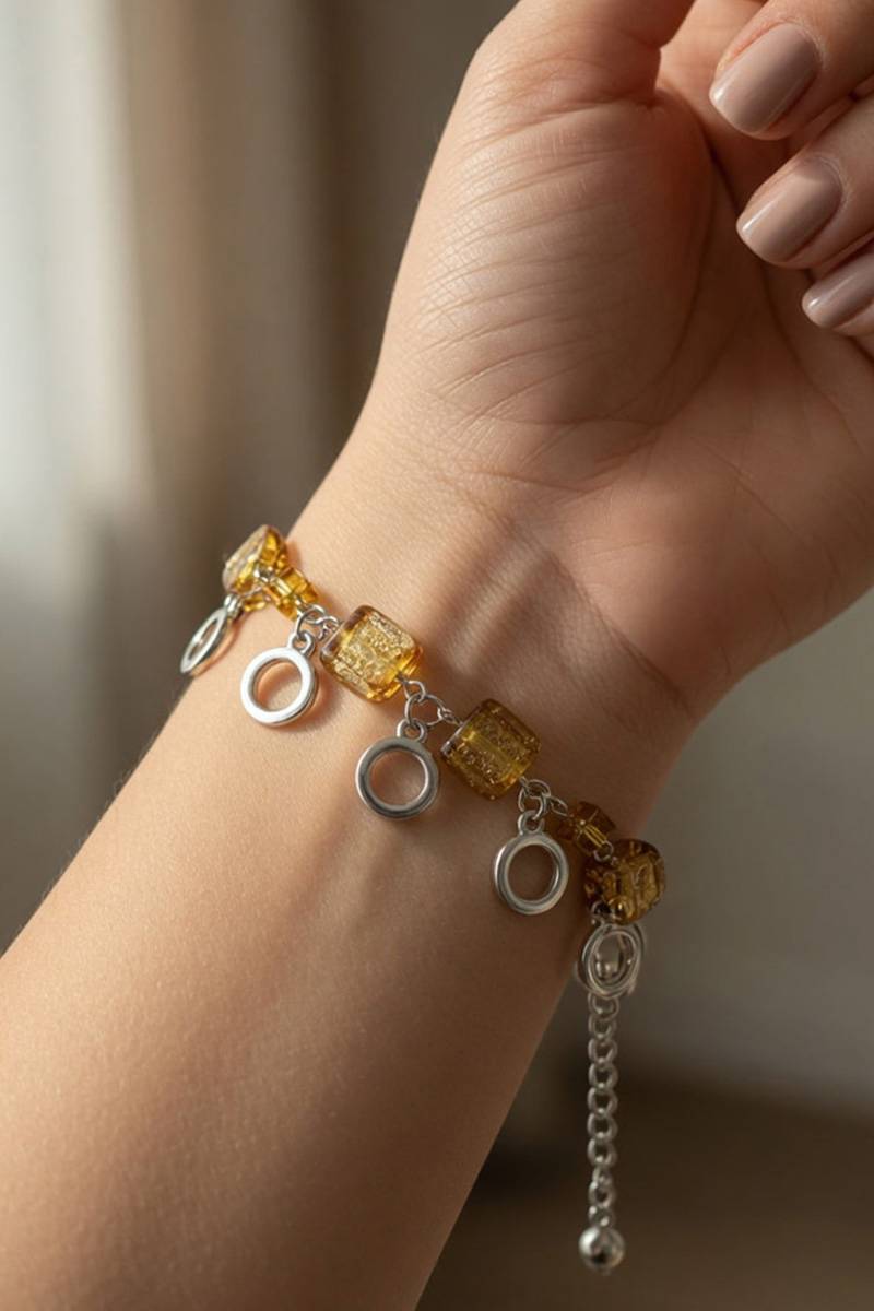 Браслет виконаний у вигляді витонченого ланцюжка з декоративними підвісками: прозорі та напівпрозорі елементи у золотих відтінках, геометричні форми та металеві кільця формують сучасний, динамічний дизайн. Завдяки подовжувальному ланцюжку браслет легко регулюється та комфортно сідає на зап’ясті.