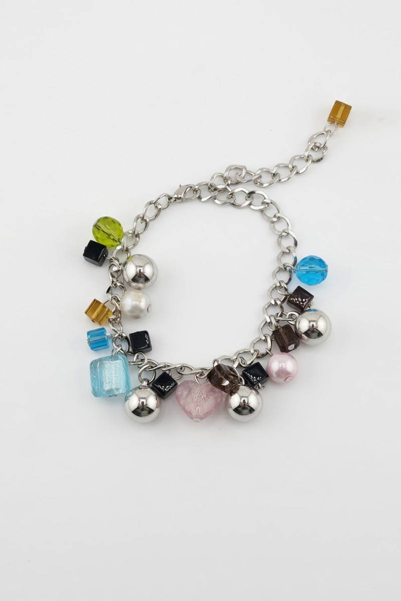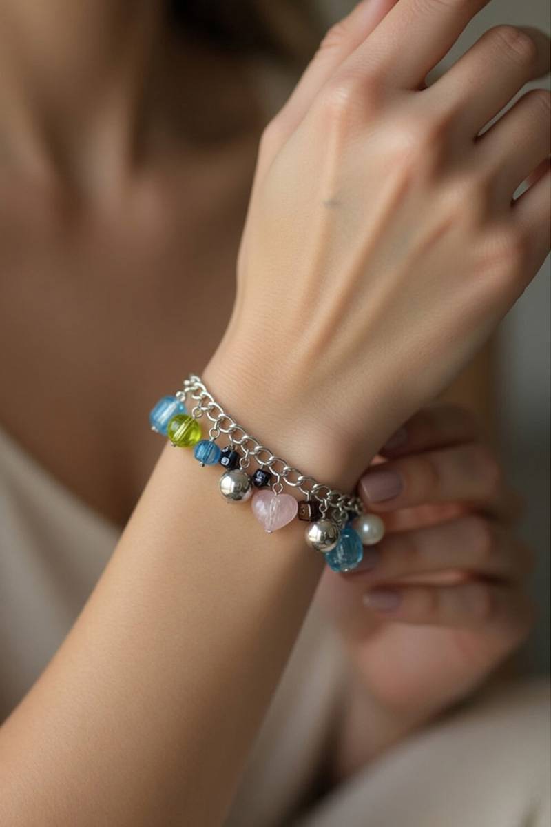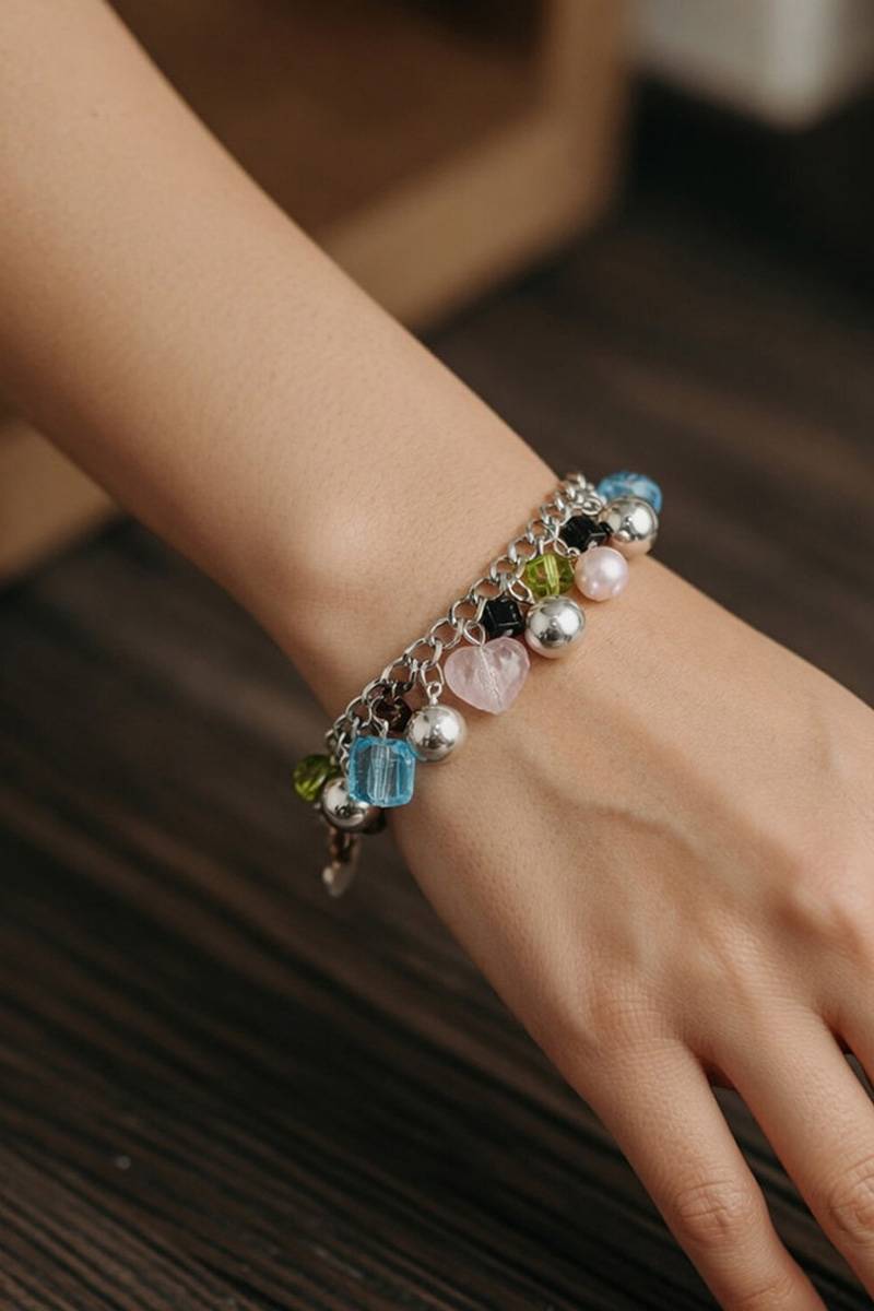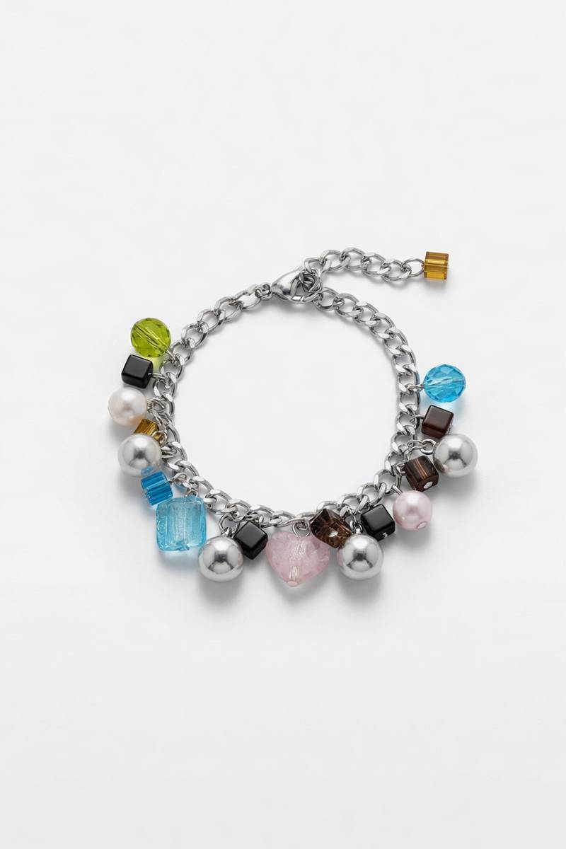 Дизайн побудований на сріблястому ланцюжку з декоративними шармами: металеві кульки, глянцеві та напівпрозорі елементи, а також акцентне серце у ніжному відтінку. Завдяки цьому браслет виглядає сучасно, але при цьому зберігає легкість і грайливість. Подовжувальний ланцюжок дозволяє легко відрегулювати посадку під будь-яке зап’ястя.