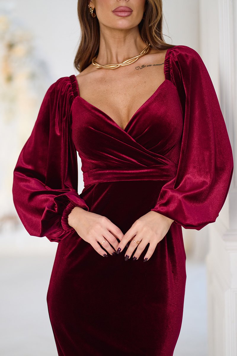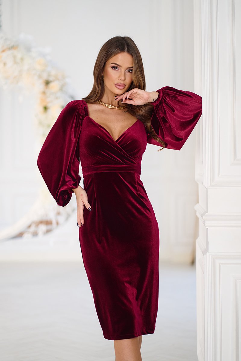 Совет стилиста: Это бордовое коктейльное платье с открытыми плечами идеально подходит для вечеринок или торжественных мероприятий. Добавьте эффектных серьг и высоких каблуков для полного образа. Такой выбор сделает вас королевой любого события, ведь зеленый бархат всегда в тренде и смотрится благородно.