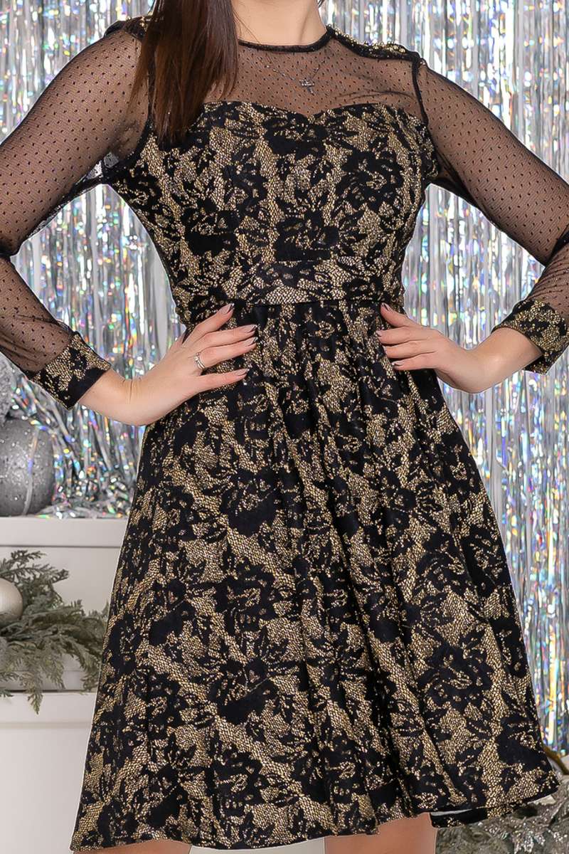 Станьте центром уваги у новорічній магії з Золота Коктейльна сукня гіпюр сяйво 9217. Неповторне сяйво тканини з гіпюру, наклеєного на трикотажну підкладку, створює неймовірний ефект розкоші. Напівпрозорі вставки з сітки додають витонченості, а пояс підкреслює лінію талії. Потайна блискавка збоку гарантує комфорт при носінні. Доступні розміри S, M, L, а яскраві кольори електрик, золотий, червоний і чорний з сріблом задовольнять будь-які смаки.
