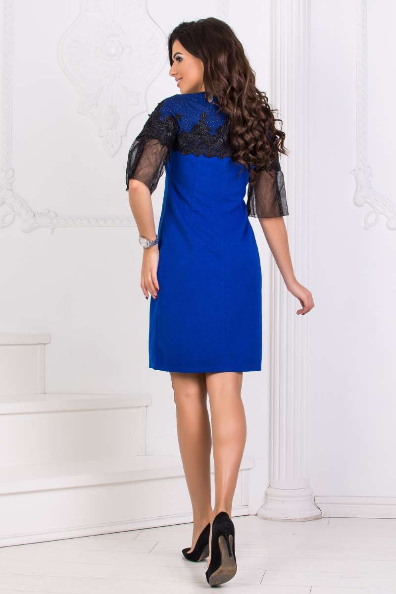 Верх сукні прикрашений сіткою з напиленням, що переходить у рукави, довжина три чверті, розширені донизу. Не глибокий напівкруглий виріз горловини, по спині вшита прихована блискавка.
