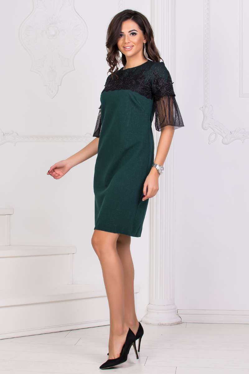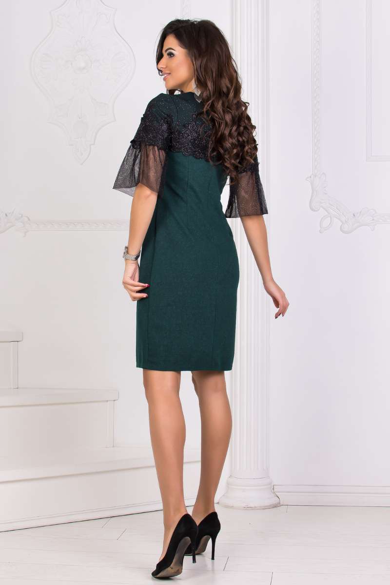 Верх сукні прикрашений сіткою з напиленням, що переходить у рукави, довжина три чверті, розширені донизу. Не глибокий напівкруглий виріз горловини, по спині вшита прихована блискавка.