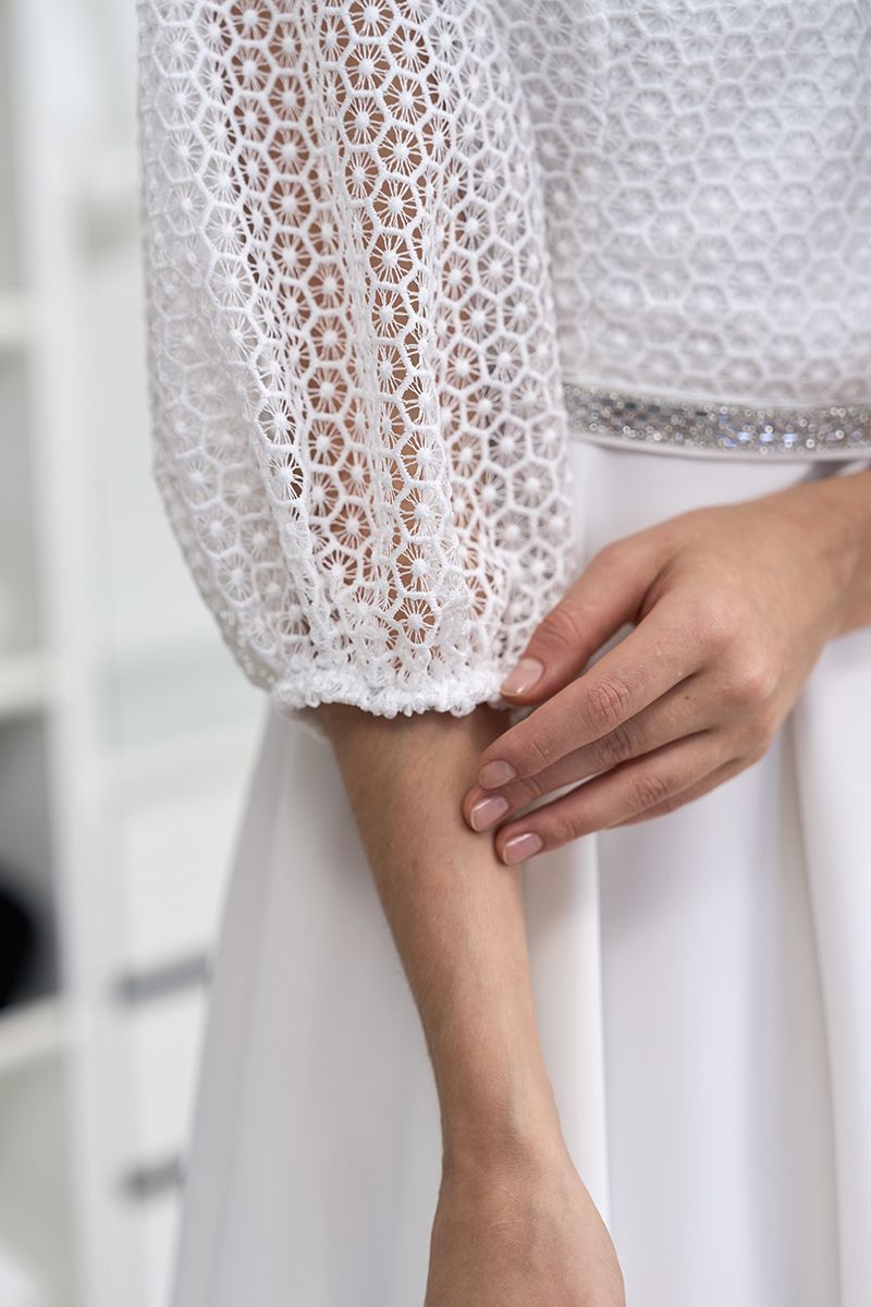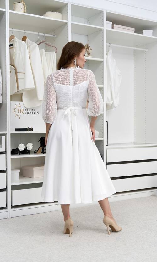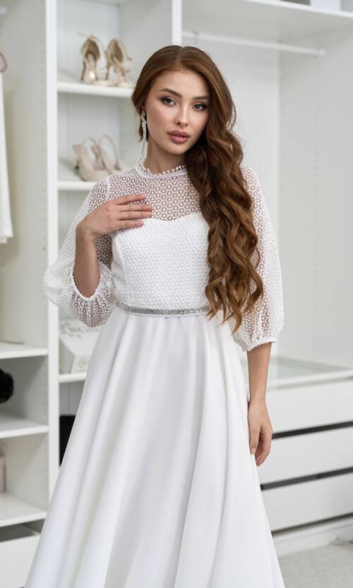 Стилист: Это платье отлично подходит для торжественных событий, таких как свадьба или вечеринка. Комбинируйте ее с классическими туфлями на каблуке и аккуратными аксессуарами для завершения образа. Благодаря своему универсальному молочному цвету, она легко сочетается с разными оттенками обуви и украшений.