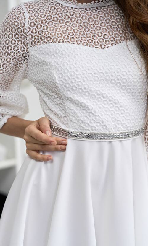Молочное Коктейльное Платье Ажурное Элегантное 24061 – это идеальный выбор для изящных женщин, стремящихся создать незабываемый образ. Изготовленное из качественного гипюра в виде сот и костюмного крепа, это платье выглядит роскошно и одновременно сдержанно. Пояс со стразами придает изысканность, а горловина, декорированная кружевом, и рукава, собранные на резинку, придают легкость и элегантность.