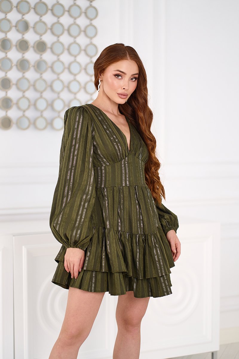 Оливковое Коктейльное платье хлопок полоска 25090 – это яркий пример сочетания природной элегантности и трендовых деталей. В оттенке оливки она выглядит особенно эффектно: теплый тон гармонично подчеркивает загар, а вертикальные полоски с серебристым блеском визуально вытягивают силуэт. Драпированные рукава собраны на резинку по манжетам, а двухъярусная пышная юбка придает образу легкости и динамики. Потайная молния на спинке делает силуэт чистоплотным и удобным в носке. Ткань – стрейч-коттон, приятная к телу и хорошо держит форму.