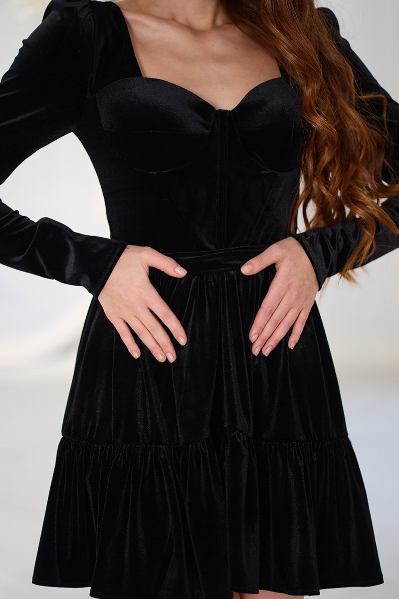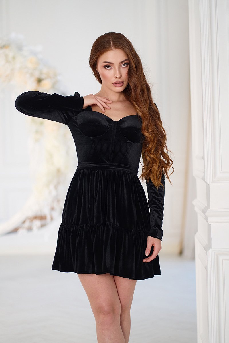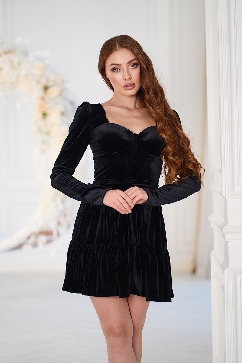 Черное коктейльное платье корсет бархат мини 25088 – это воплощение женственности и элегантной сексуальности в одном образе. Благодаря мягкому бархату платье нежно облегает тело, создавая соблазнительный силуэт. Встроенный корсет с чашечками и косточками подчеркивает линию груди, а упругая талия обеспечивает комфорт на протяжении всего вечера. Модель дополнена куличом из той же ткани и аккуратной потайной молнией на спинке. Мягкая оборка внизу добавляет кокетство и динамику.
