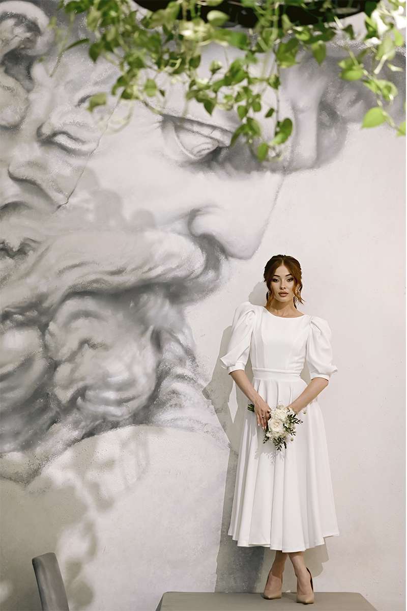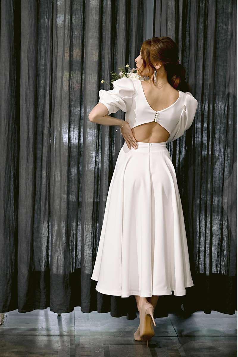 Молочное Коктейльное платье открытая спина 22060 сделано из костюмной ткани.