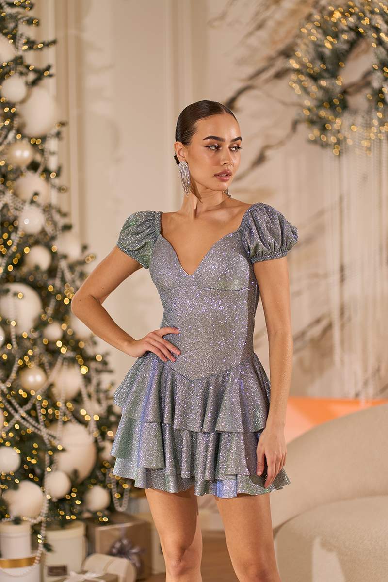 Выполненное из эластичного трикотажа с люрексовыми блестками-хамелеоном, это платье меняет свой цвет в зависимости от освещения — от серебристо-фиолетового до зеленого, создавая иллюзию подвижного света на каждом изгибе. Плотная трикотажная подкладка обеспечивает комфорт, поролоновые чашки красиво подчеркивают линию груди, а юбка с ярусами придает игривость и объем. Плечики на резинке мягко фиксируются и образуют женственный силуэт, открывающий ключицы. Застежка – потайная молния сзади.