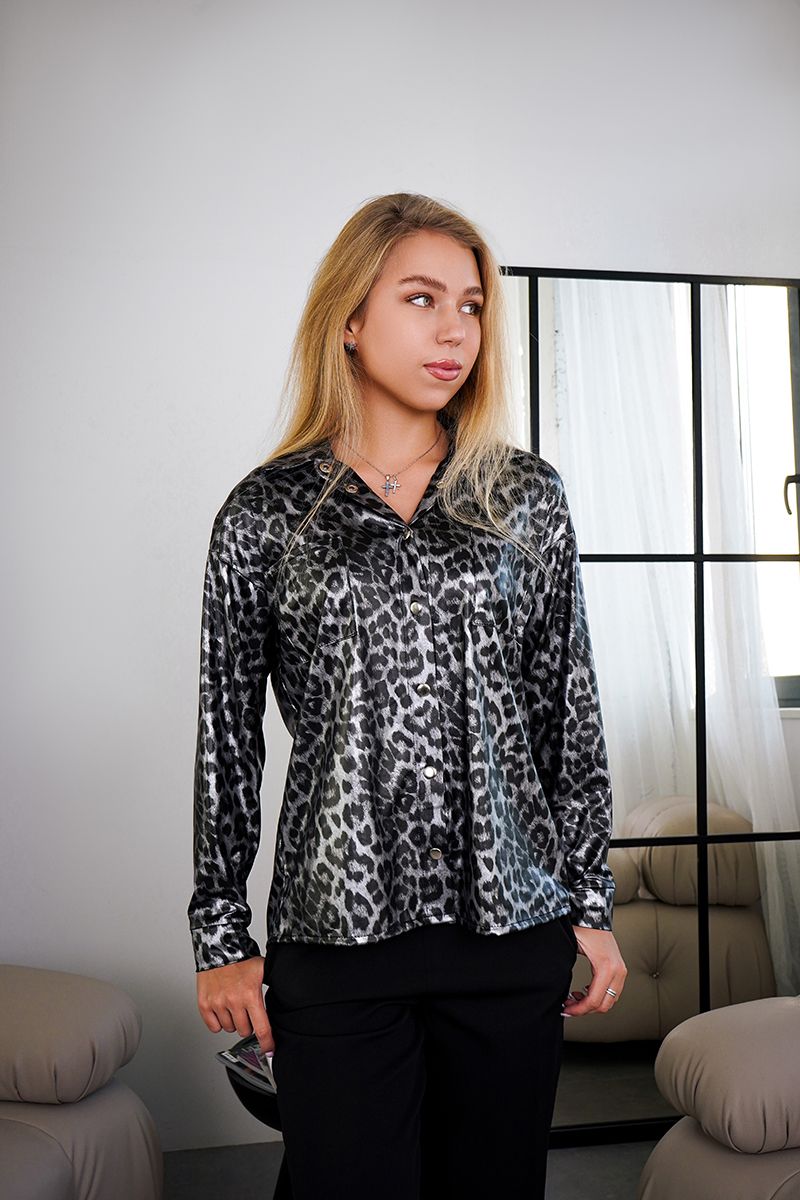 Серебряная Рубашка Тигр Лак Принт 24090 – это уникальный вариант для смелых образов. Выполненная из ткани лаке на трикотажной основе, эта рубашка имеет характерный леопардовый принт с серебристым блеском, что придает роскоши и оригинальности. Функциональные кнопки на планке и удобные нагрудные карманы придают практичность. Доступно в размерах от S до XL.