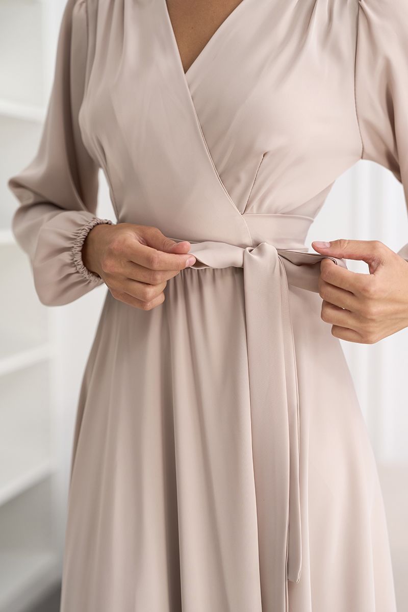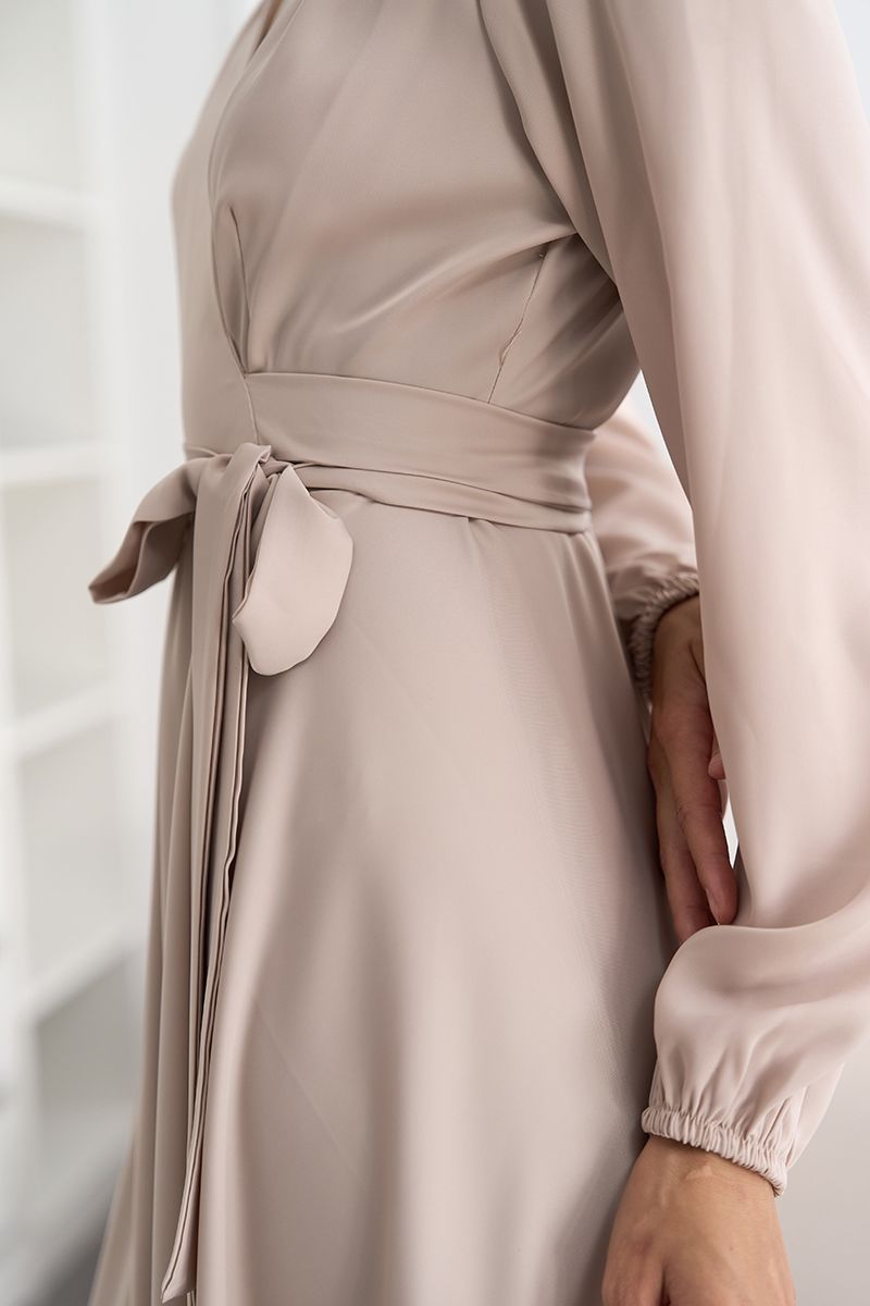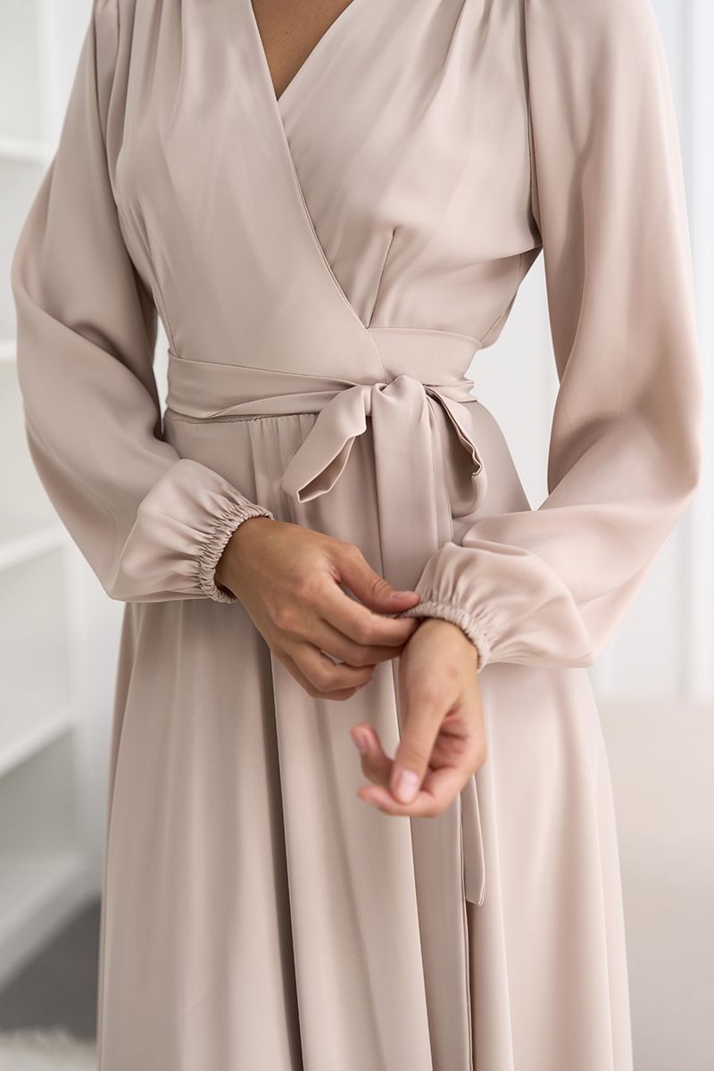 Бежевое Вечернее платье атлас на запах 25087 – это воплощение изящества и легкости в каждом движении.