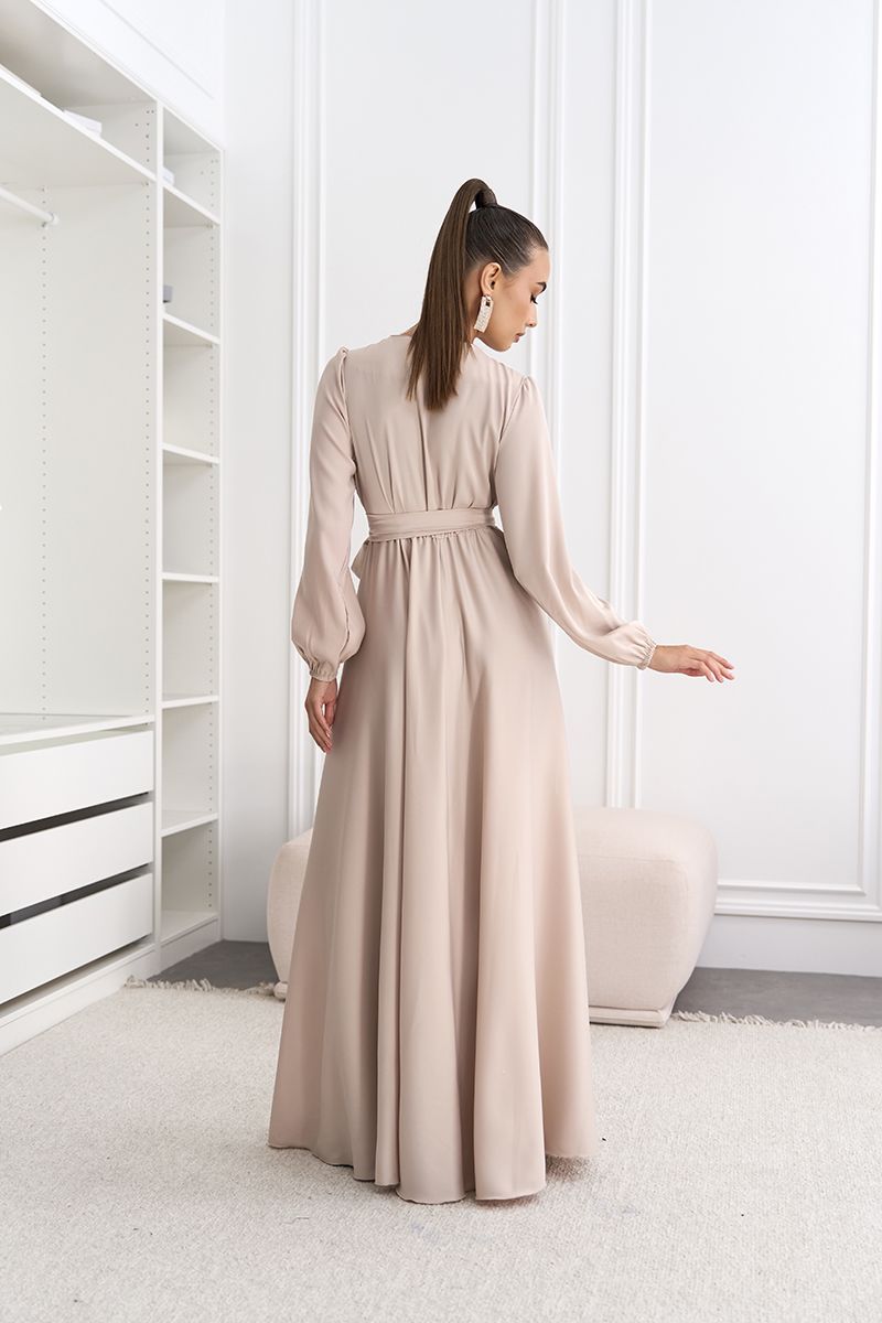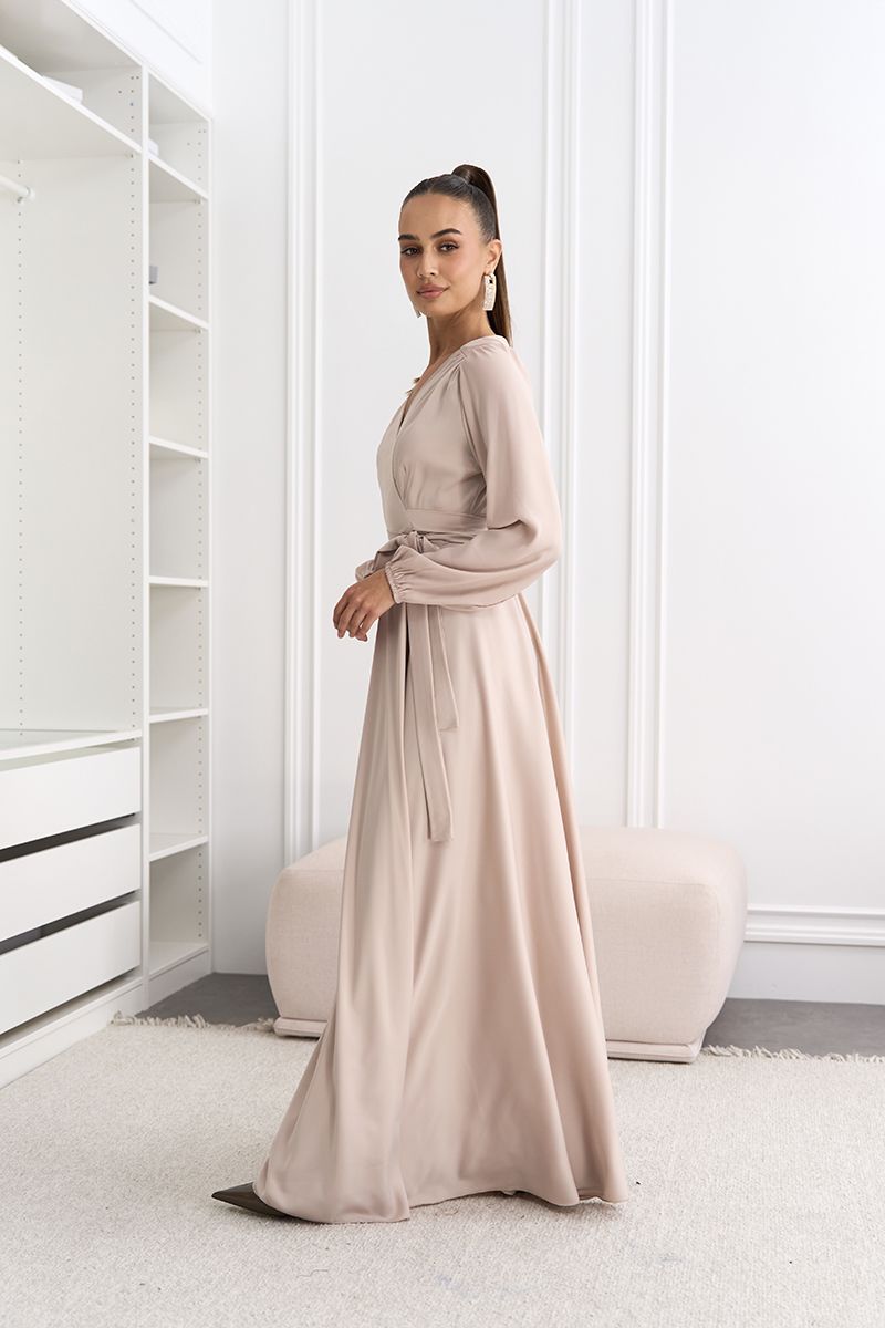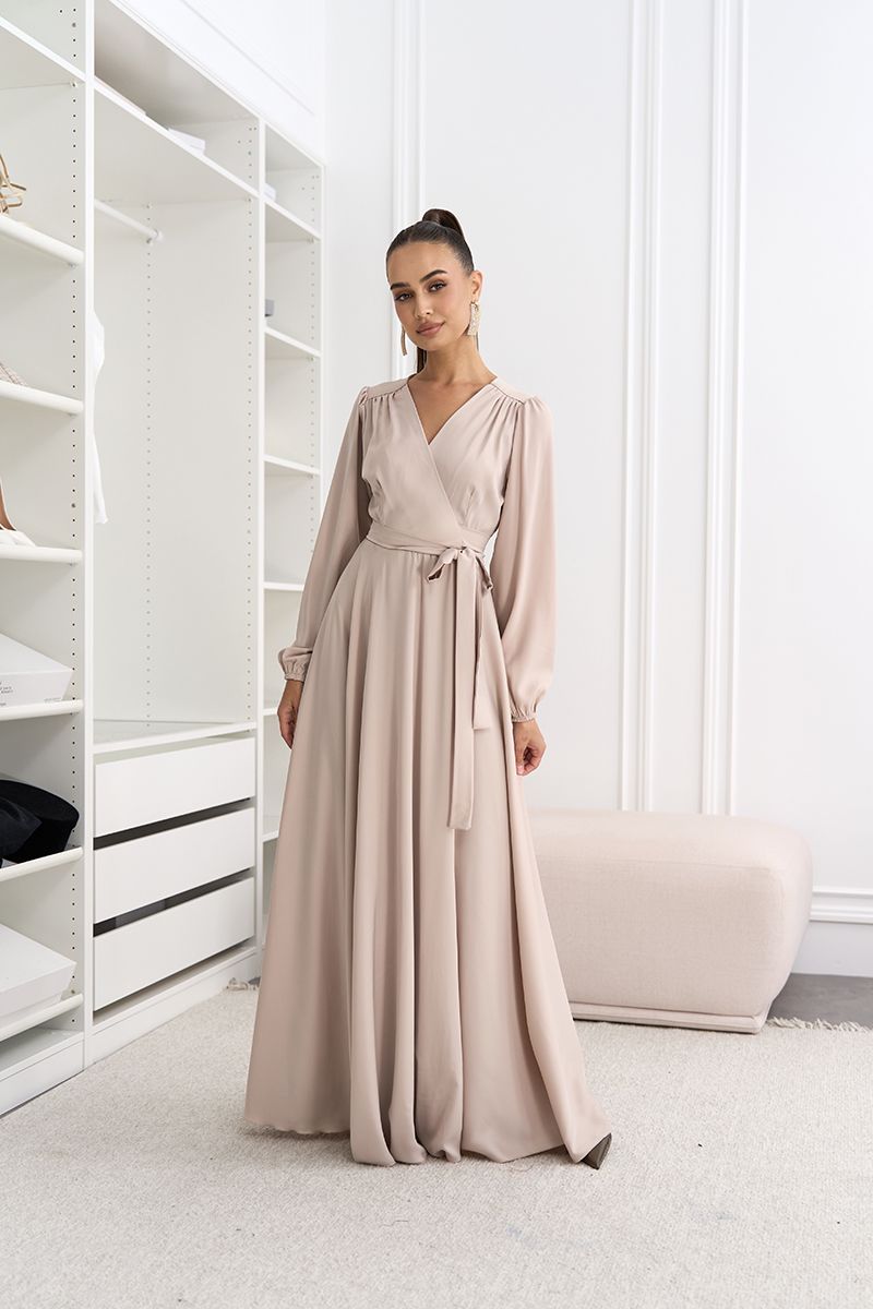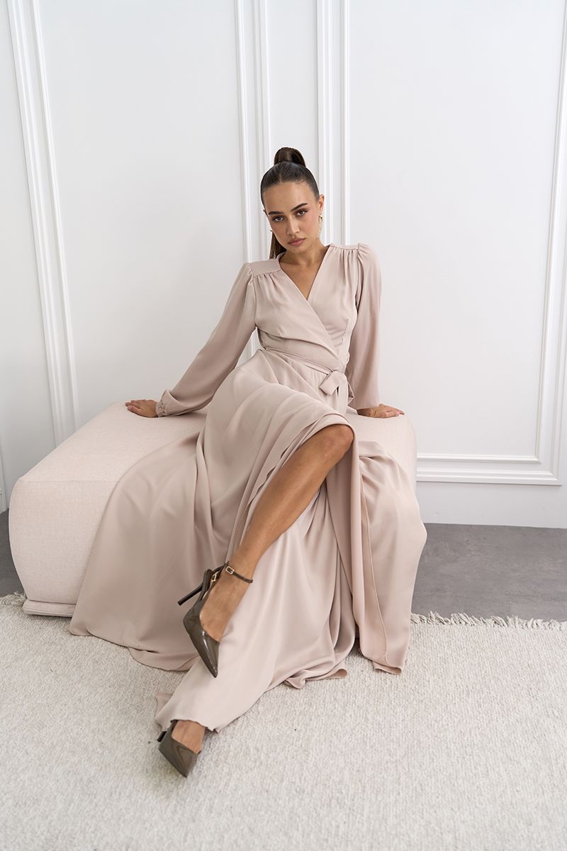 Бежевое Вечернее платье атлас на запах 25087 – это воплощение изящества и легкости в каждом движении.