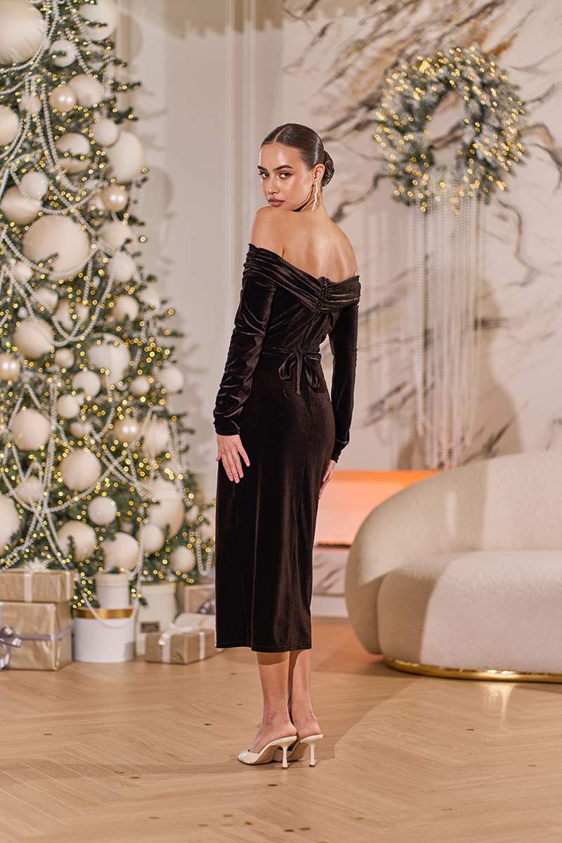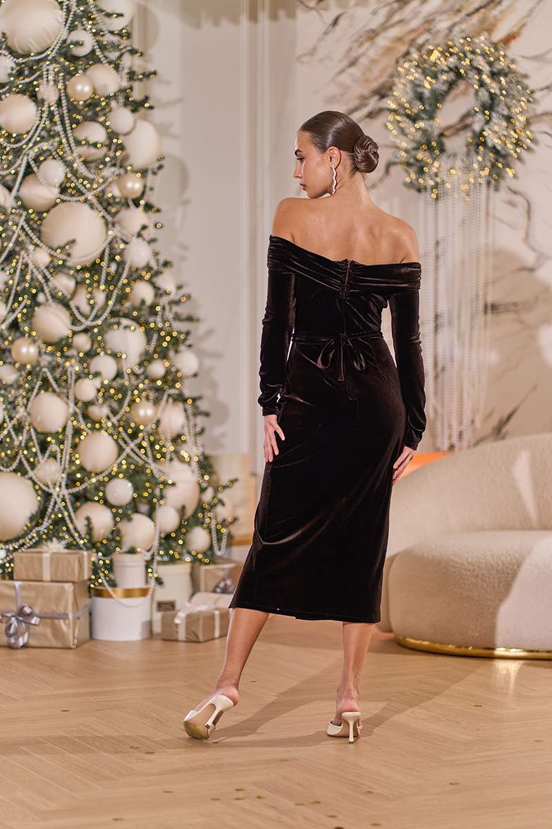 Шоколадное Вечернее Платье Открытые Плечи 24106 не только выглядит роскошно, но и дарит уверенность в собственной непревзойденности. Благодаря эластичности бархата она прекрасно адаптируется к фигуре и не сковывает движения. Потайная молния обеспечивает идеальную посадку, а пояс позволяет подчеркнуть талию или скорректировать пропорции. Если вы не уверены в выборе размера – напишите нам, и мы подберем для вас идеальный вариант. Доступна в размерах XS, S, M, L и в двух роскошных цветах – шоколадном и черном.