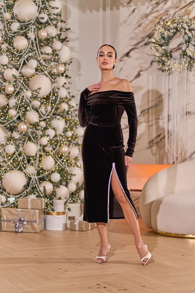Шоколадное Вечернее Платье Открытые Плечи 24106 – это воплощение изысканности, чувственности и безупречного стиля. Бархатная ткань с мягким переливом нежно окутывает фигуру, открытые плечи подчеркивают женственность, а глубокий разрез, украшенный блестящими стразами, придает дерзкой элегантности.