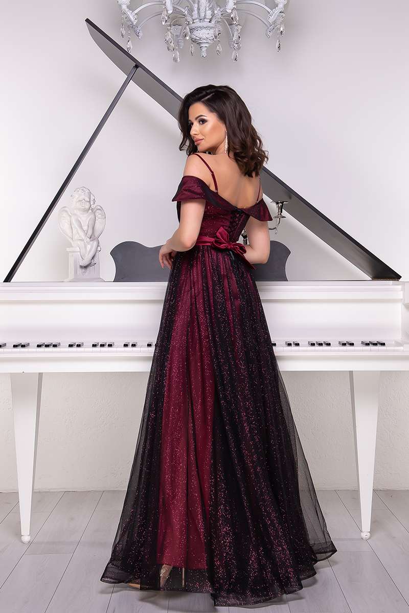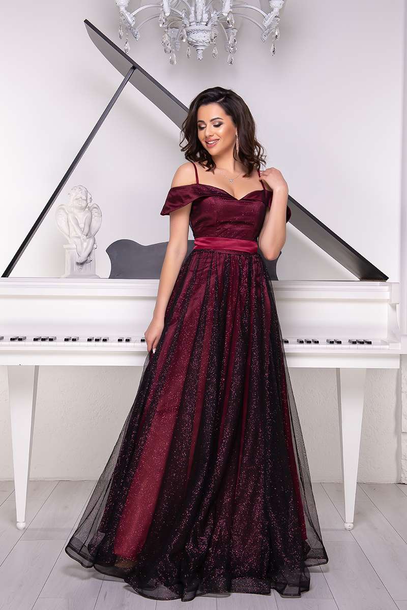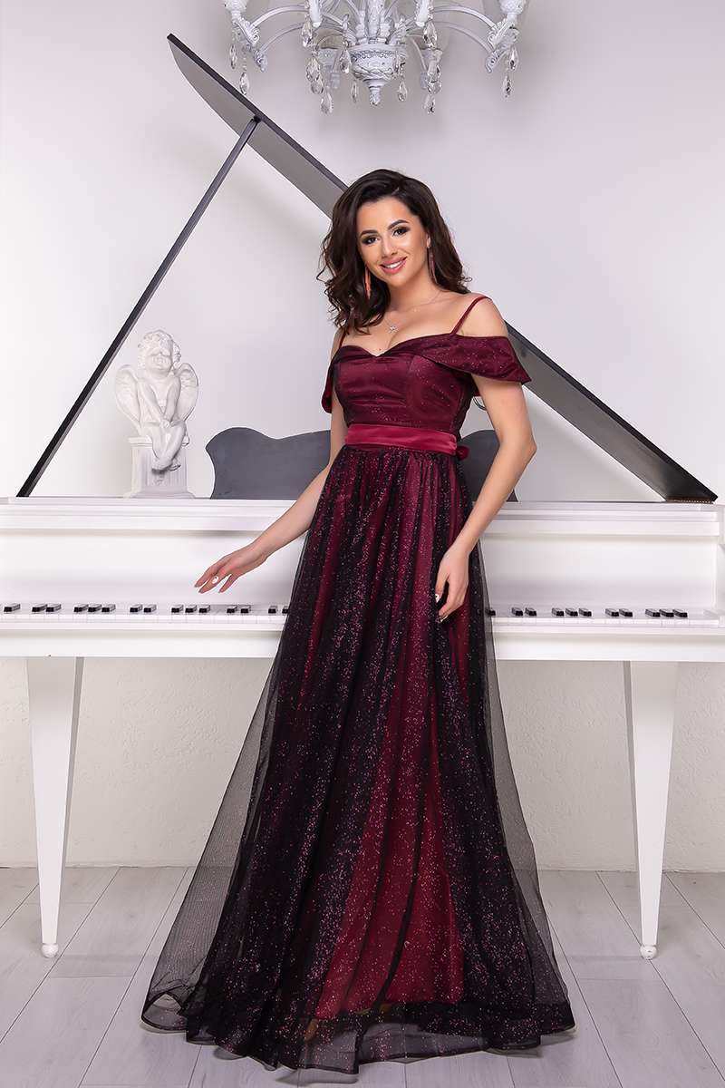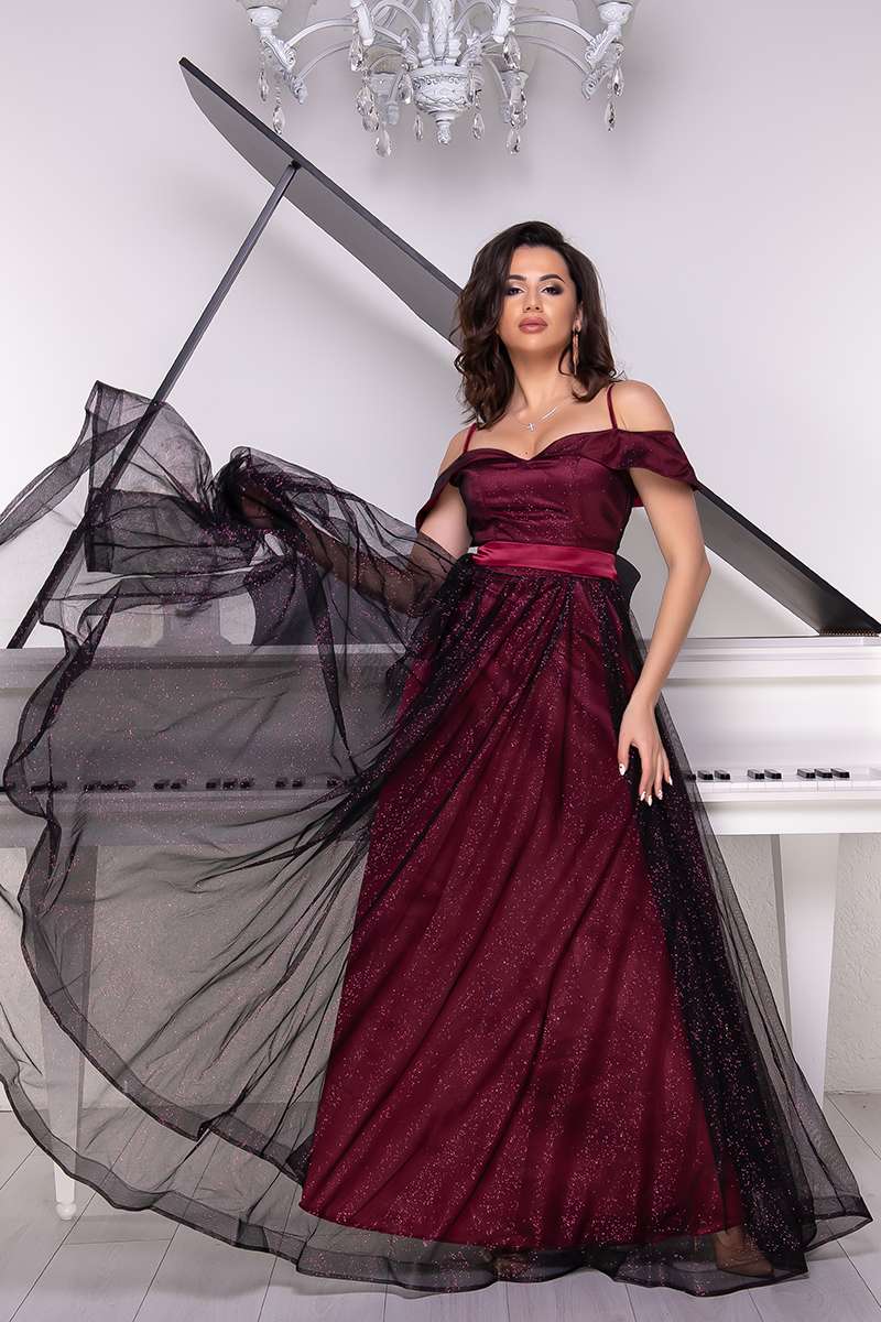 а зверху корсетна шнурівка. Довжина максі, а пишна сітка лягає хвилями.