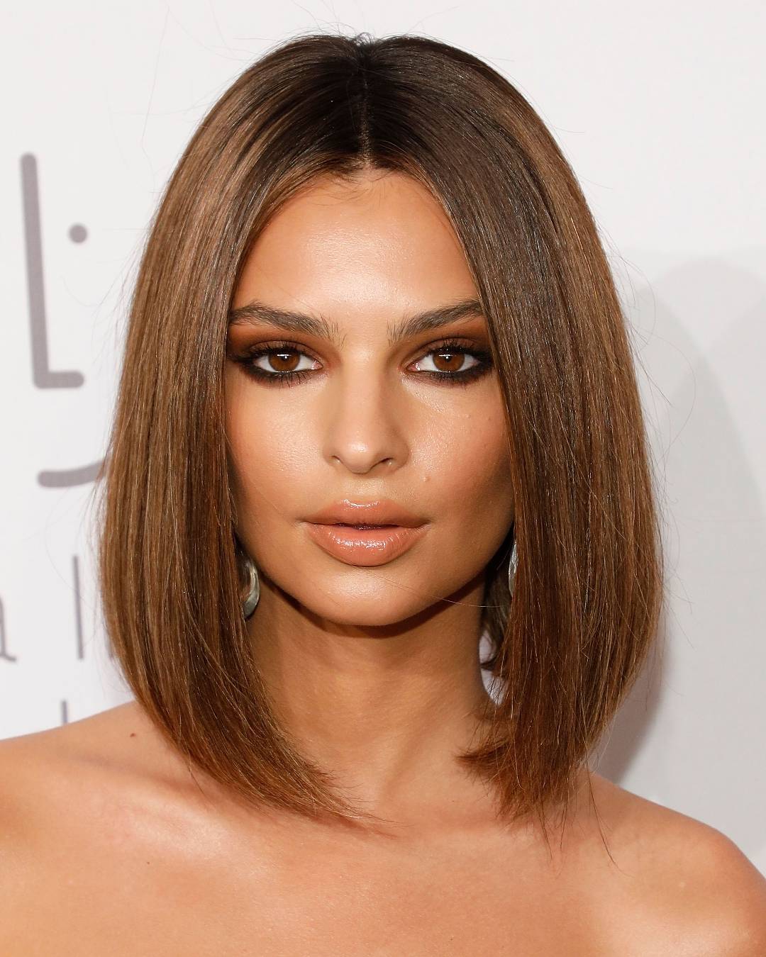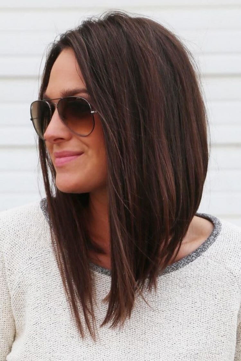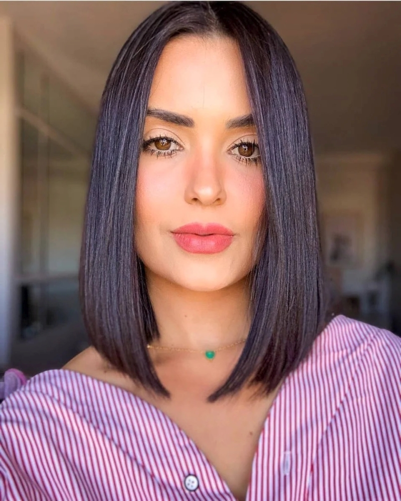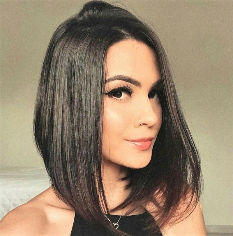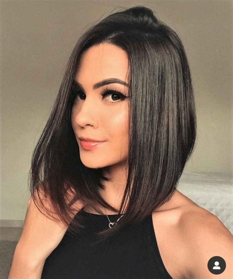 Удлиненное каре также имеет ровный прямой срез, но при этом полностью закрывает шею и плечи. В другом варианте передние пряди имеют большую длину по сравнению с затылком и закрывают ключицы.