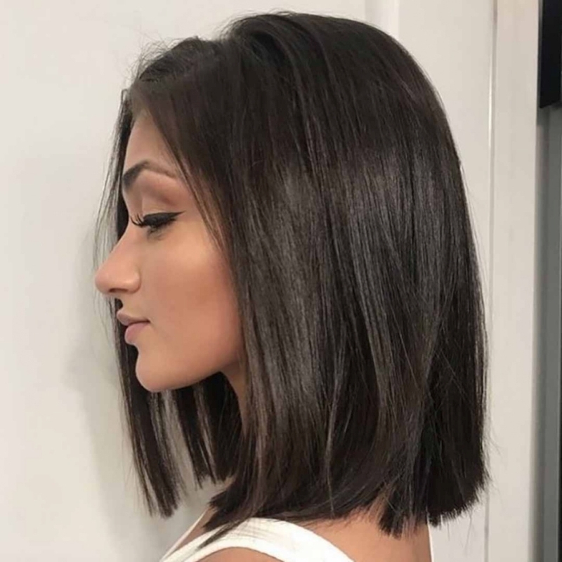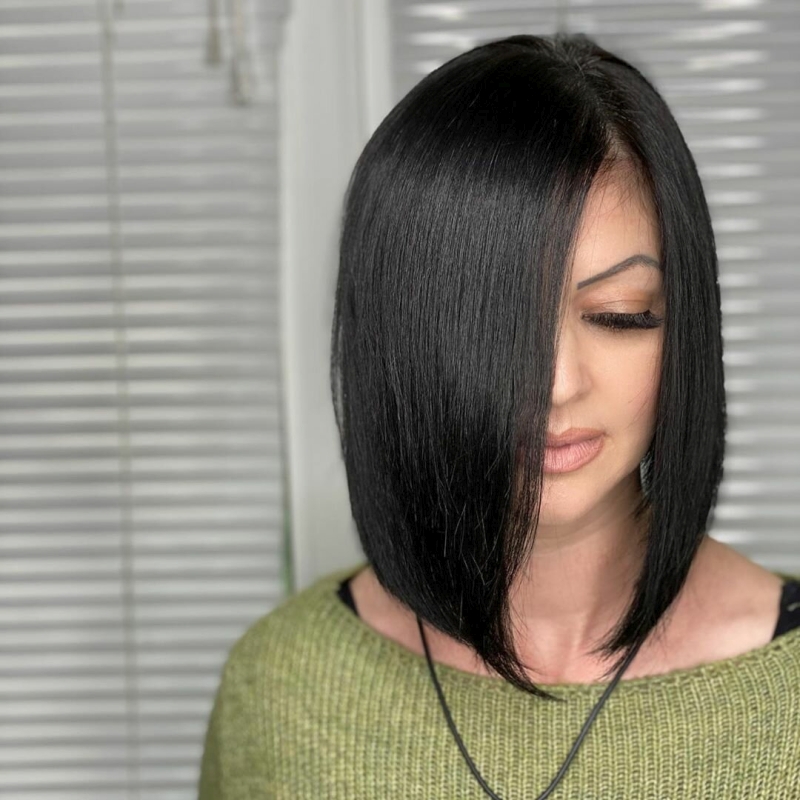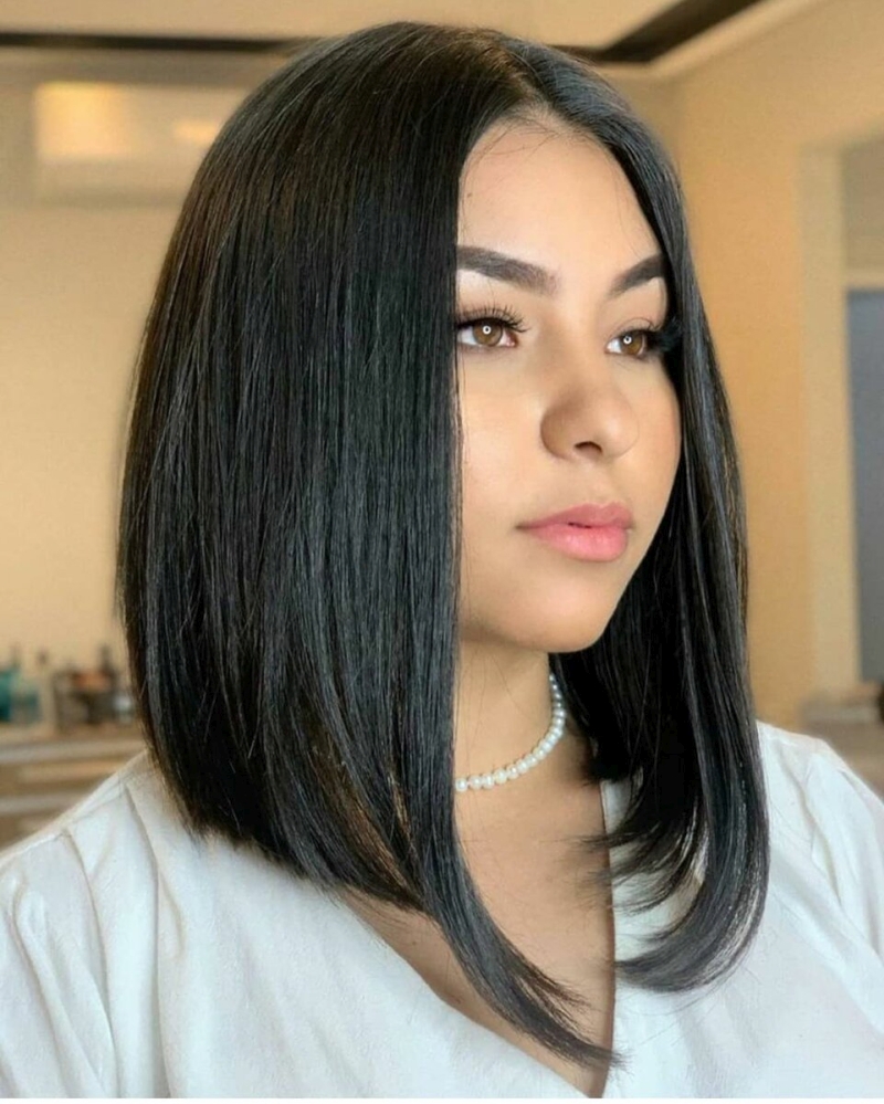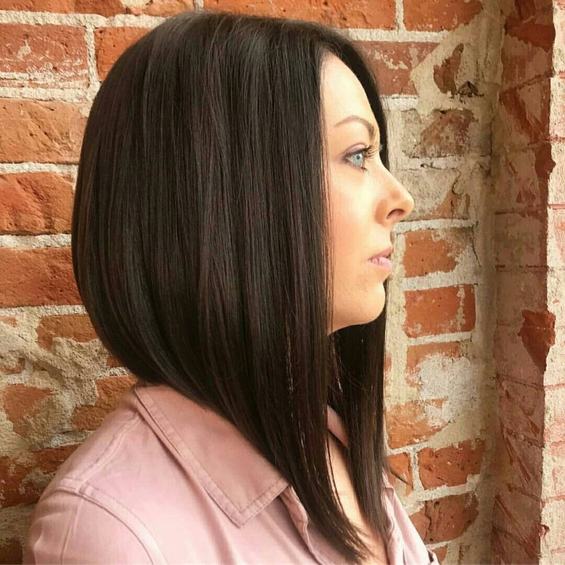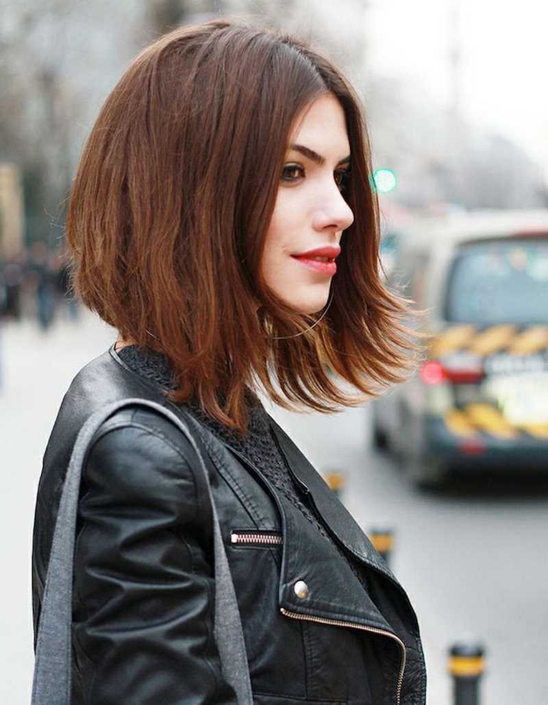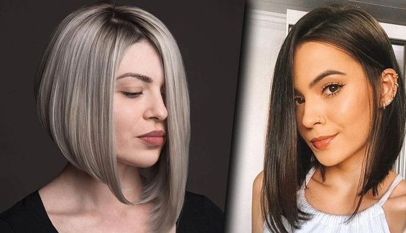 Удлиненное каре также имеет ровный прямой срез, но при этом полностью закрывает шею и плечи. В другом варианте передние пряди имеют большую длину по сравнению с затылком и закрывают ключицы.
