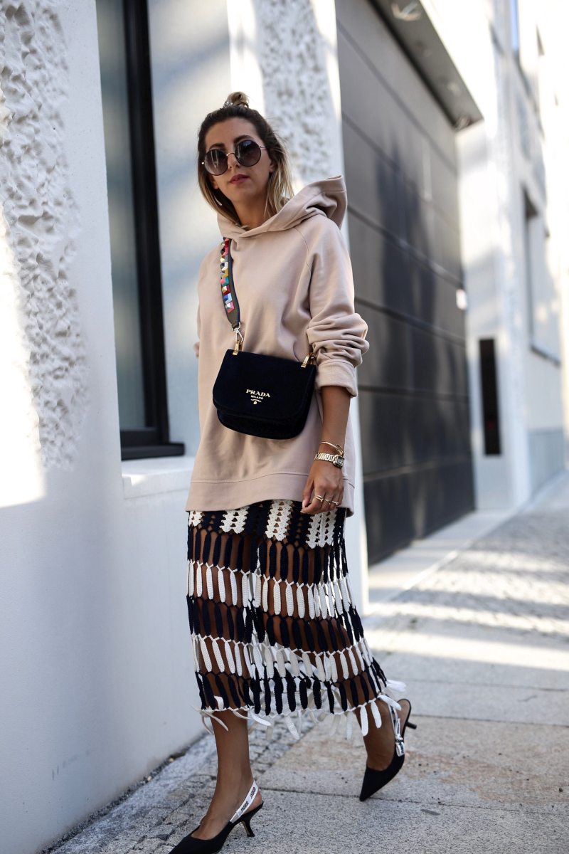 Стильный нетривиальный и свежий образ получится при сочетании худи и юбки. Хотя понятно, что такой “градус моды” могут позволить себе не все.