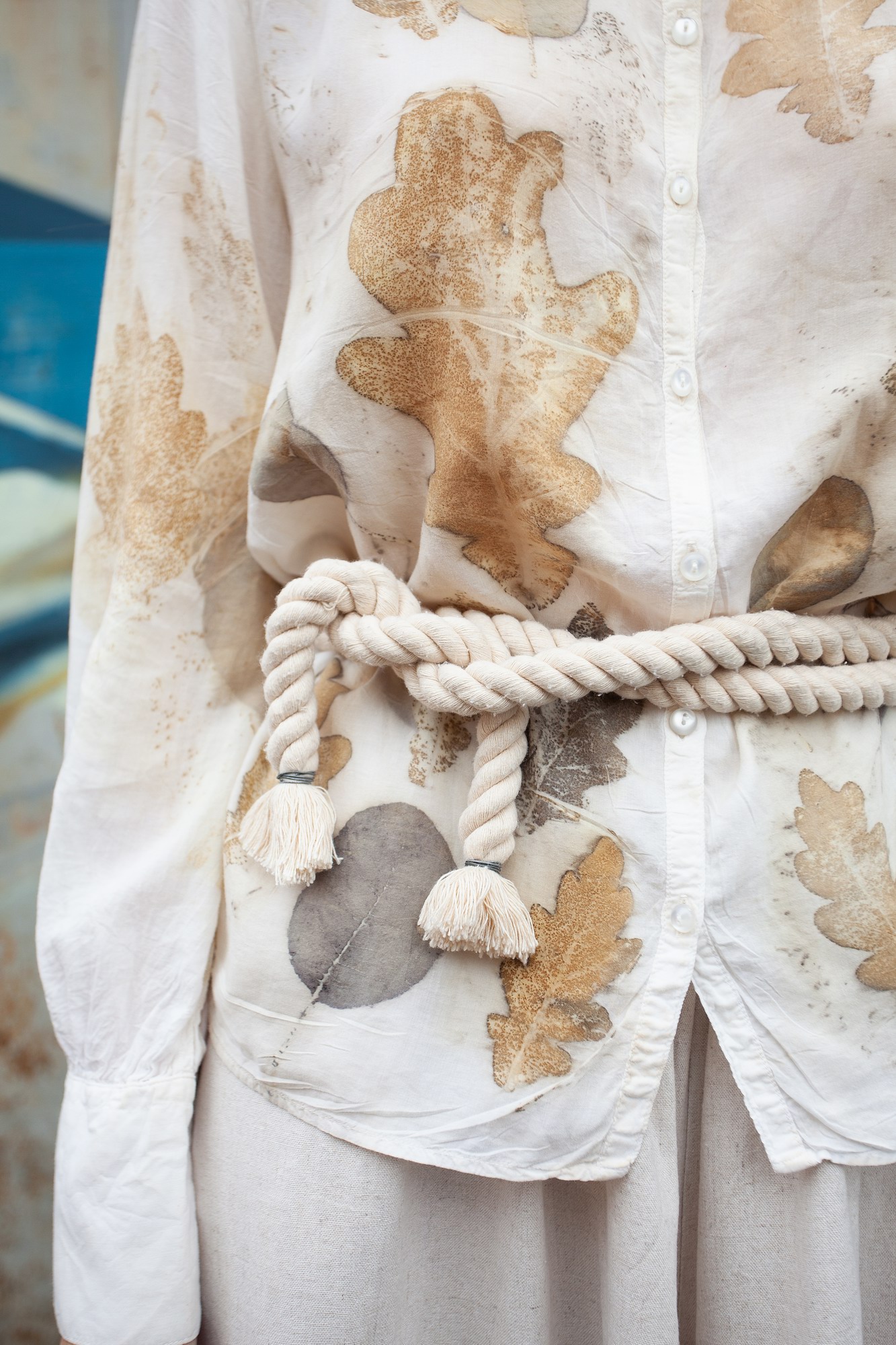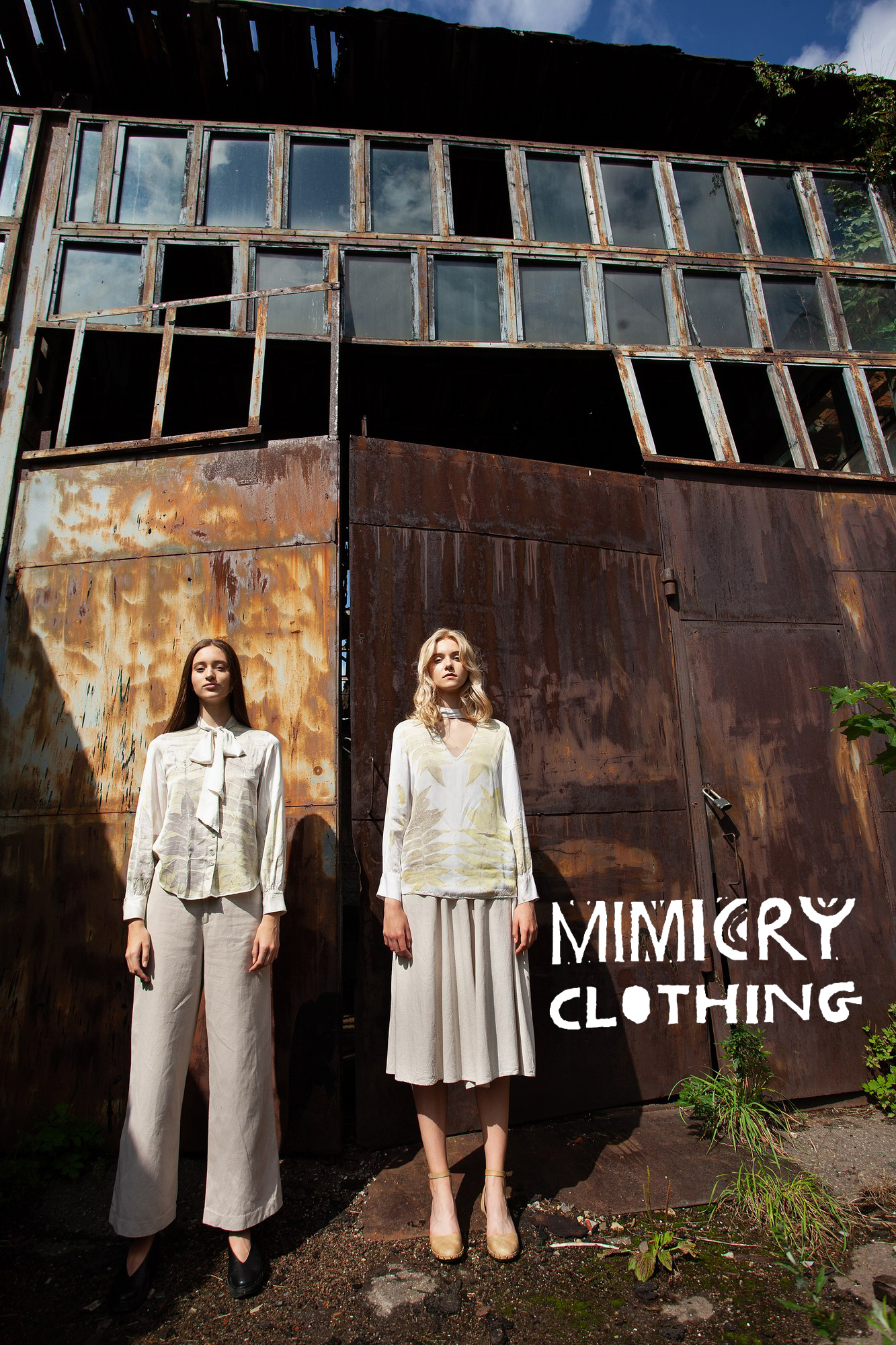 Колекція апсайкл сорочок MIMICRY clothing створена на основі якісних речей з натуральних тканин, які отримують нове життя з допомогою техніки природного фарбування. Мімікрія – це про контакт з природою та про справжність принта: білі сорочки фарбовані рослинами в техніці, що існує століттями — пігменти з рослини залишаються на тканині шляхом трикратної термообробки. Усі речі дизайнерка Богдана Войтенко принтує власноруч.